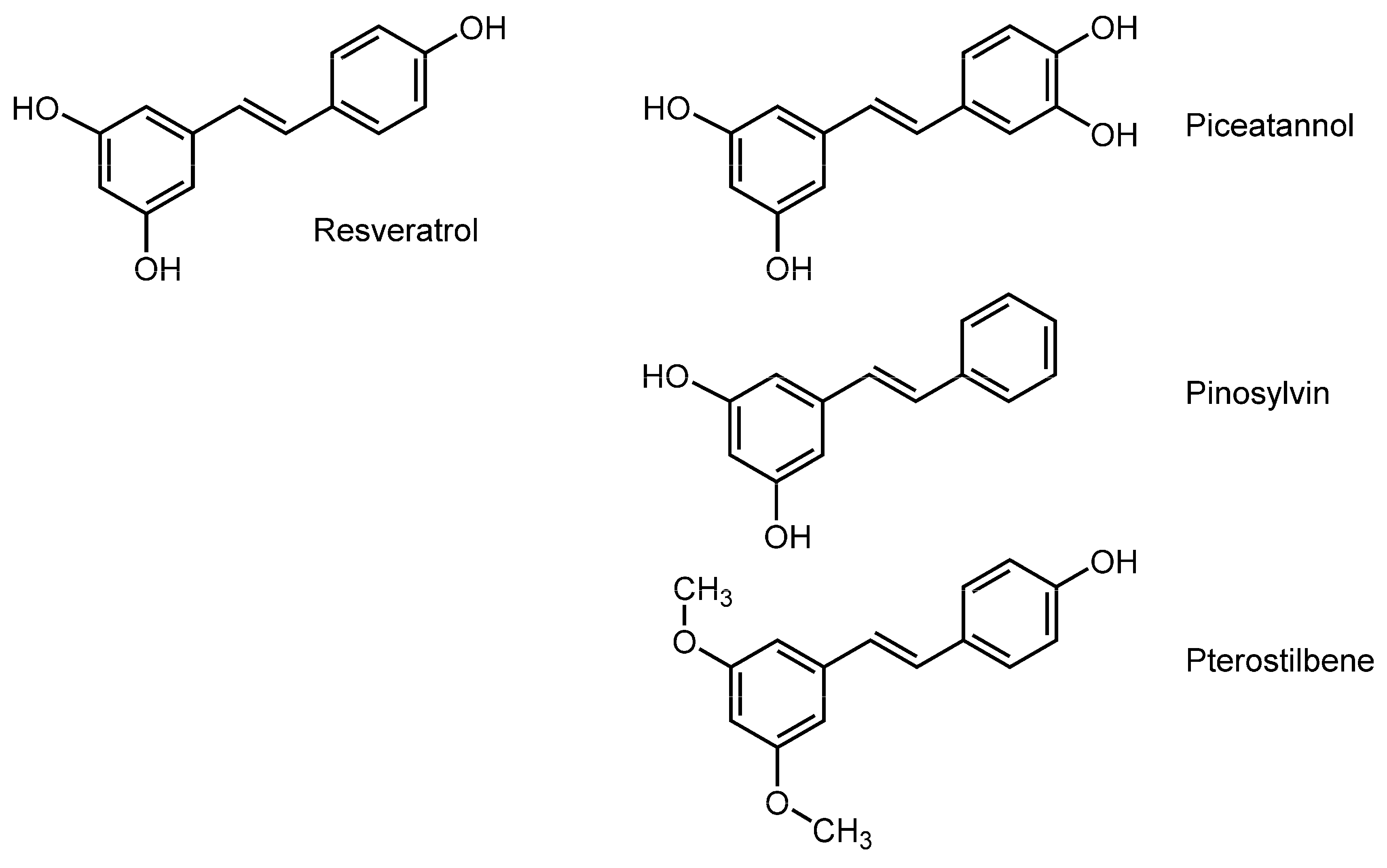 Stilbenoids are polyphenolic stilbenes, including resveratrol (trans-3,5,4′-trihydroxystilbene), piceatannol (trans-3,3′,4,5′-tetrahydroxystilbene), pterostilbene (trans-3,5-dimethoxy-4′-hydroxystilbene), pinosylvin (trans-3,5-dihydroxystilbene) and their derivatives (Figure 3). Many of them have the characteristics of phytoalexin, a secondary metabolite that is synthesized by the infectious stimuli and accumulated at the area of pathogen infection to exhibit antimicrobial activity. Japanese knotweed (Fallopia japonica) is a concentrated source of resveratrol. Resveratrol and pterostilbene are contained in grapes at a high concentration and in other berry fruits such as blueberry, cranberry, and bilberry. Resveratrol is also present in peanuts, especially sprouted peanuts. Stilbenoids have been expected to exert antioxidant, antitumor, anti-inflammatory, anti-arteriosclerotic, and dementia-preventive effects.
