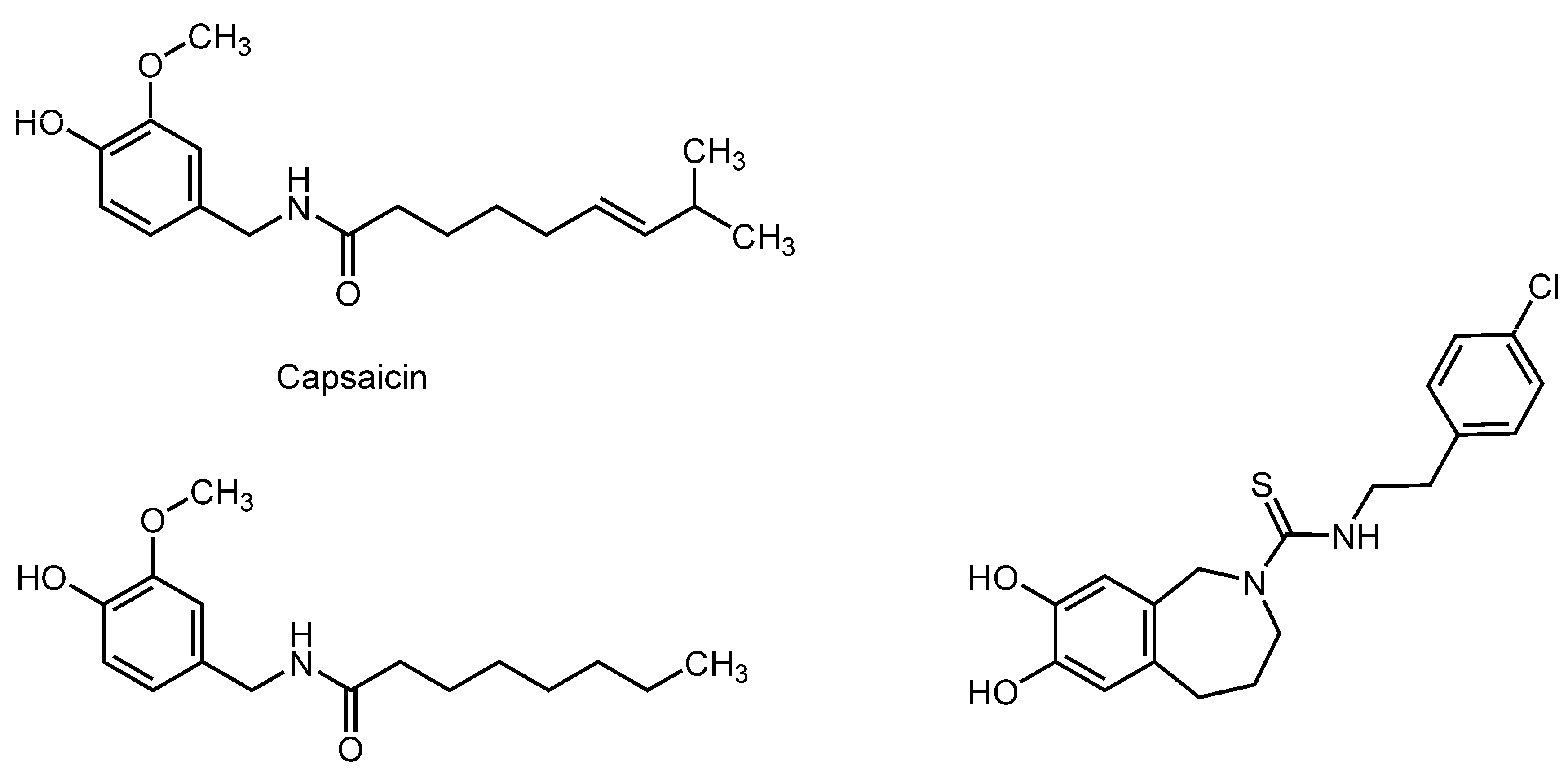 Capsaicin (8-methyl-N-vanillyl-trans-6-nonenamide), a pungent component in chili pepper belonging to the genus Capsicum, is one of the bioactive capsaicinoids (Figure 4). Its structurally related dihydrocapsaicin, nordihydrocapsaicin, homodihydrocapsaicin, and homocapsaicin are also included in capsaicinoids. On the initial application, capsaicin causes the excitation of peripheral sensory nerve endings to depolarize and generate action potentials, resulting in burning pain and hyperalgesia. With repeated or prolonged application, however, the stimulation with capsaicin is followed by desensitization and subsequent conduction block and nociceptor inhibition, thereby producing analgesia. Capsaicin has been used as an analgesic in topical ointment, spray, dermal patches, and cream, and is currently used for the treatment of painful conditions like diabetic neuropathy and rheumatoid arthritis.