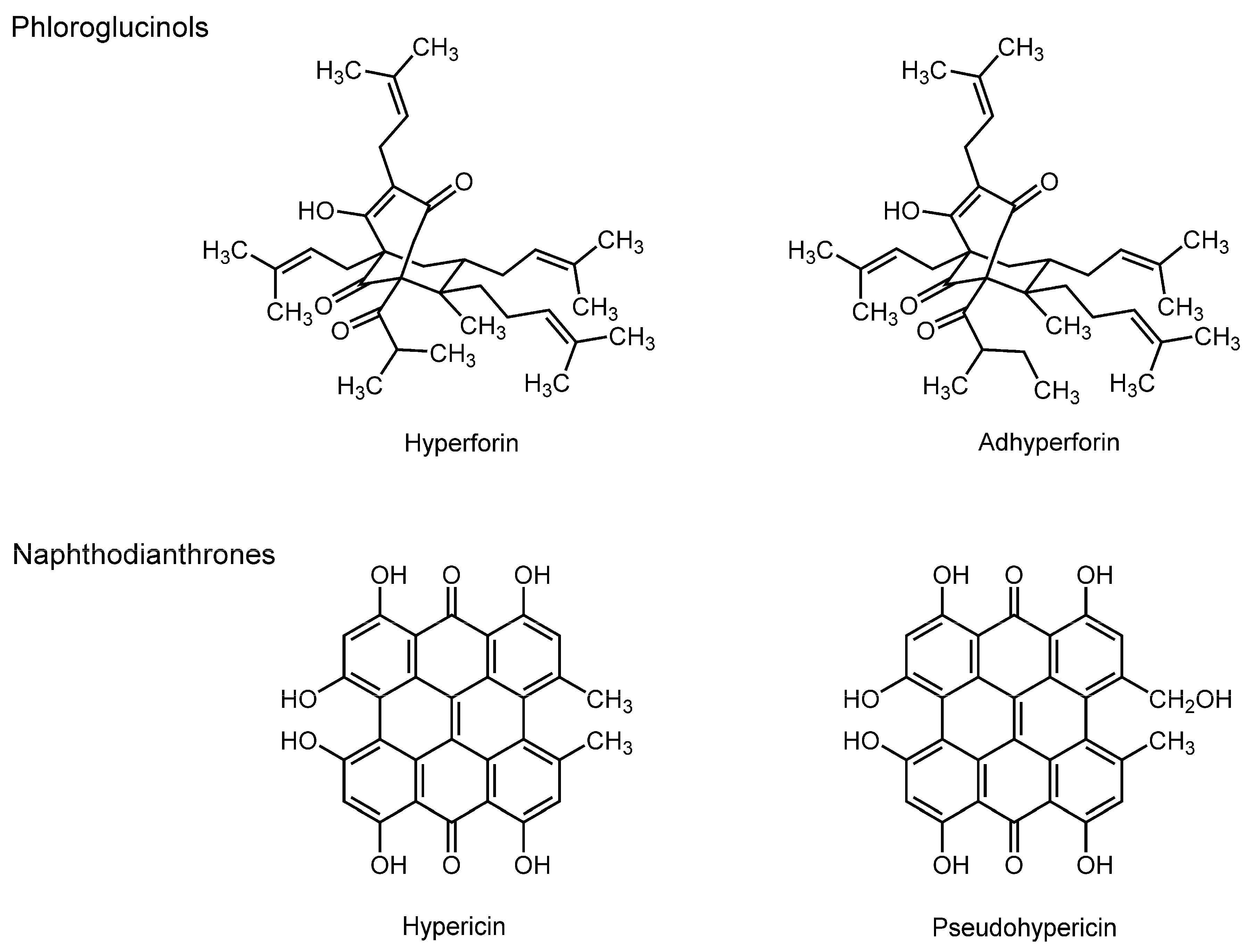 The popular plant name “St. John’s wort” corresponds to several species of the genus Hypericum (Hypericum perforatum, Hypericum hirsutum, Hypericum patulum, and Hypericum olympicum), which have been traditionally used for mild to moderate depression and also as a topical remedy for infected wounds and inflammatory skin diseases [112]. Besides flavonoids (such as rutin, quercetin, quercitrin, and isoquercitrin), two classes of phytochemicals, prenylated phloroglucinols and naphthodianthrones, are isolated from the stems, leaves, and flowers of Hypericum perforatum as bioactive components. The former includes hyperforin and adhyperforin, and the latter, hypericin and pseudohypericin (Figure 5).