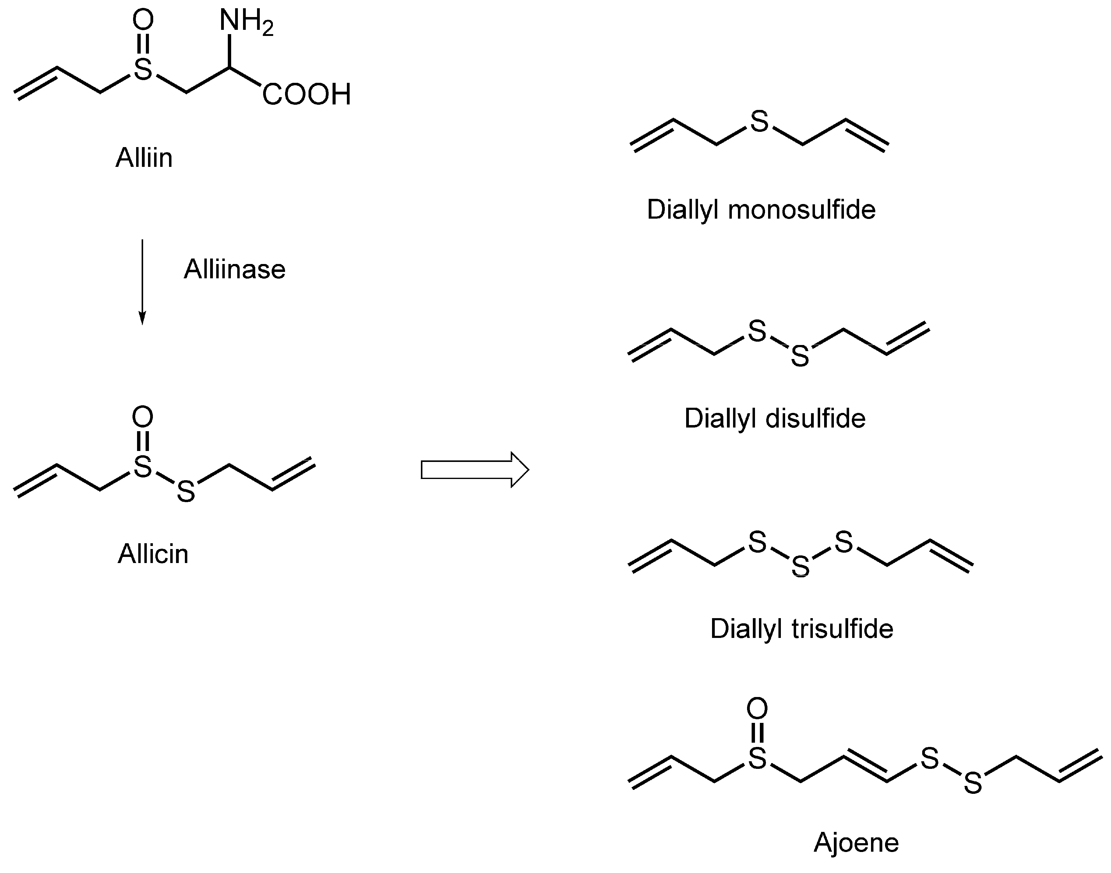Spice and food additive garlic (Allium sativum) has been used for a long time as a medicinal herb because of its health benefits such as cardiovascular, antihypertensive, antiatherosclerotic, antithrombotic, hypolipidemic, antimicrobial, cancer-preventive, immunomodulatory, hepatoprotective, and antidiabetic effects, almost all of which are supported by epidemiological, experimental, and preclinical studies. Garlic and its related plants (onion, shallot, leek, scallion, and chive) contain two classes of bioactive components, flavonoids and organosulfur compounds. The latter phytochemicals provide these plants, especially garlic, with not only a characteristic odor and pungent taste but also various bioactivities. Intact garlic bulbs contain a large amount of γ-glutamyl-S-allyl-l-cysteine, which is hydrolyzed and oxidized to form alliin. When the bulbs are crushed, chopped, or damaged, alliinase is released to transform alliin to allicin enzymatically. Allicin is so unstable that it is rapidly converted to diallyl monosulfide, diallyl disulfide, diallyl trisulfide, and ajoene (Figure 6).