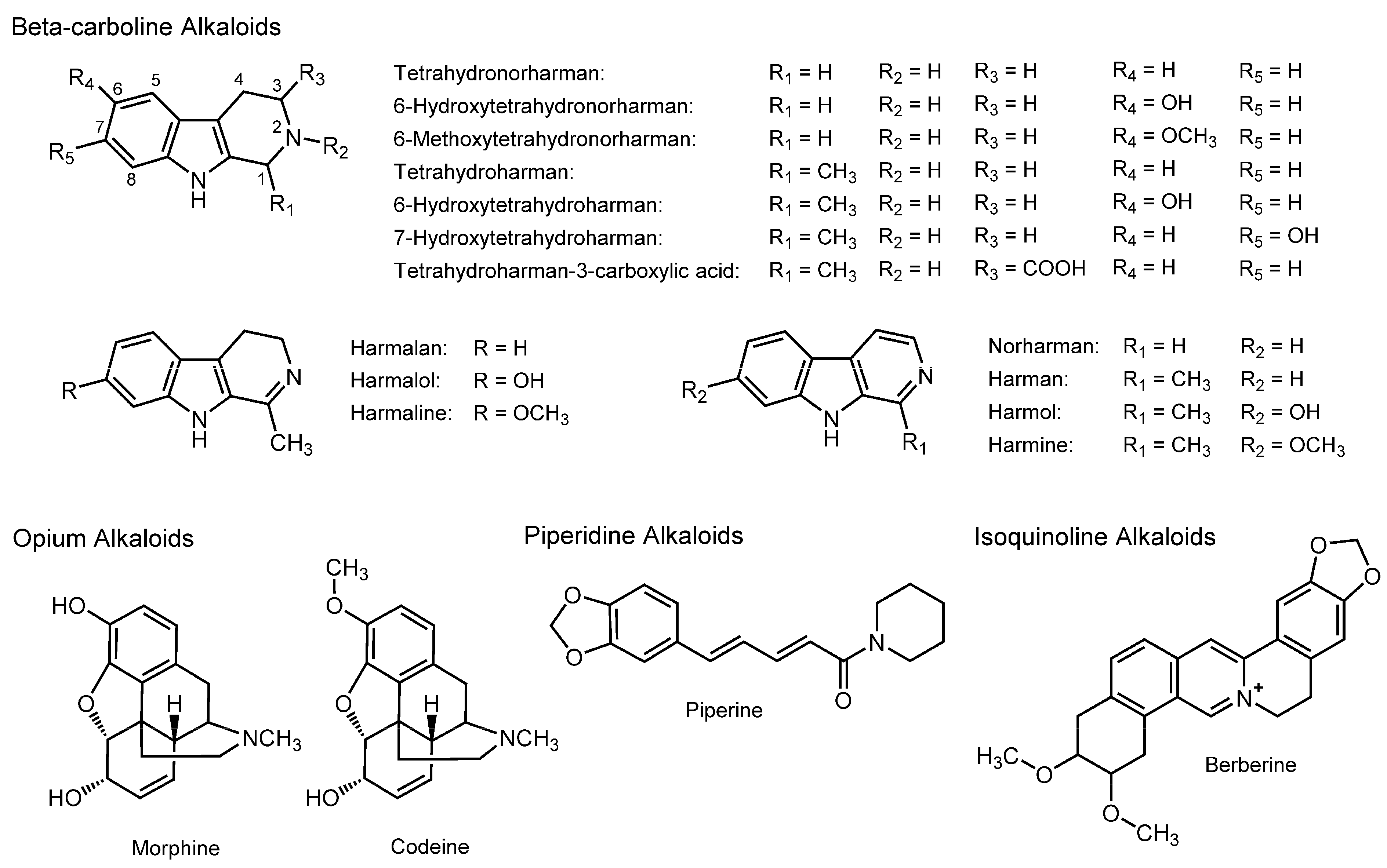 The general term “passionflower” is used for various species of the genus Passiflora, of which Passiflora incarnata is the most popular herb with a medicinal value, followed by Passiflora edulis and Passiflora foetida. Leaves, roots, and tea products of passionflower have been used for insomnia, anxiety, epilepsy, neuralgia, hysteria, ulcers, and burns. Passiflora incarnata and Passiflora foetida are also known to have anxiolytic, analgesic, and anti-inflammatory effects. Bioactive components in these plants are flavonoids (such as apigenin, luteolin, quercetin, kaempferol, and chrysin) and alkaloids. The relevant alkaloids include β-carbolines harman (1-methyl-β-carboline), norharman (β-carboline), harmol (7-hydroxy-1-methyl-β-carboline), and harmine (7-methoxy-1-methyl-β-carboline); dihydro-β-carbolines harmalan (1-methyl-3,4-dihydro-β-carboline), harmalol (7-hydroxy-1-methyl-3,4-dihydro-β-carboline), and harmaline (7-methoxy-1-methyl-3,4-dihydro-β-carboline); and tetrahydro-β-carbolines tetrahydroharman (1-methyl-1,2,3,4-tetrahydro-β-carboline), tetrahydronorharman (1,2,3,4-tetrahydro-β-carboline), and tetrahydroharmol (7-hydroxy-1-methyl-1,2,3,4-tetrahydro-β-carboline) (Figure 7). Beta-carboline alkaloids were originally isolated from Peganum harmala, which has been traditionally used for ritual and medicinal preparations in the Middle East, North Africa, and Central Asia [122]. Of interest, β-carboline alkaloids are not only distributed in medicinal plants, herbs, fruits, and vegetables, but are also found in human tissues and body fluids. Different β-carboline alkaloids show the inhibitory effect on amine neurotransmitter metabolism and the affinity for serotonin, dopamine, benzodiazepine, and imidazoline receptors in the central nervous system. They also have cardiovascular (vasorelaxant, antihypertensive, and antithrombotic), analgesic, antinociceptive, antidepressive, antimicrobial, antiviral, antiparasitic, DNA intercalating, and hallucinogenic properties [123].