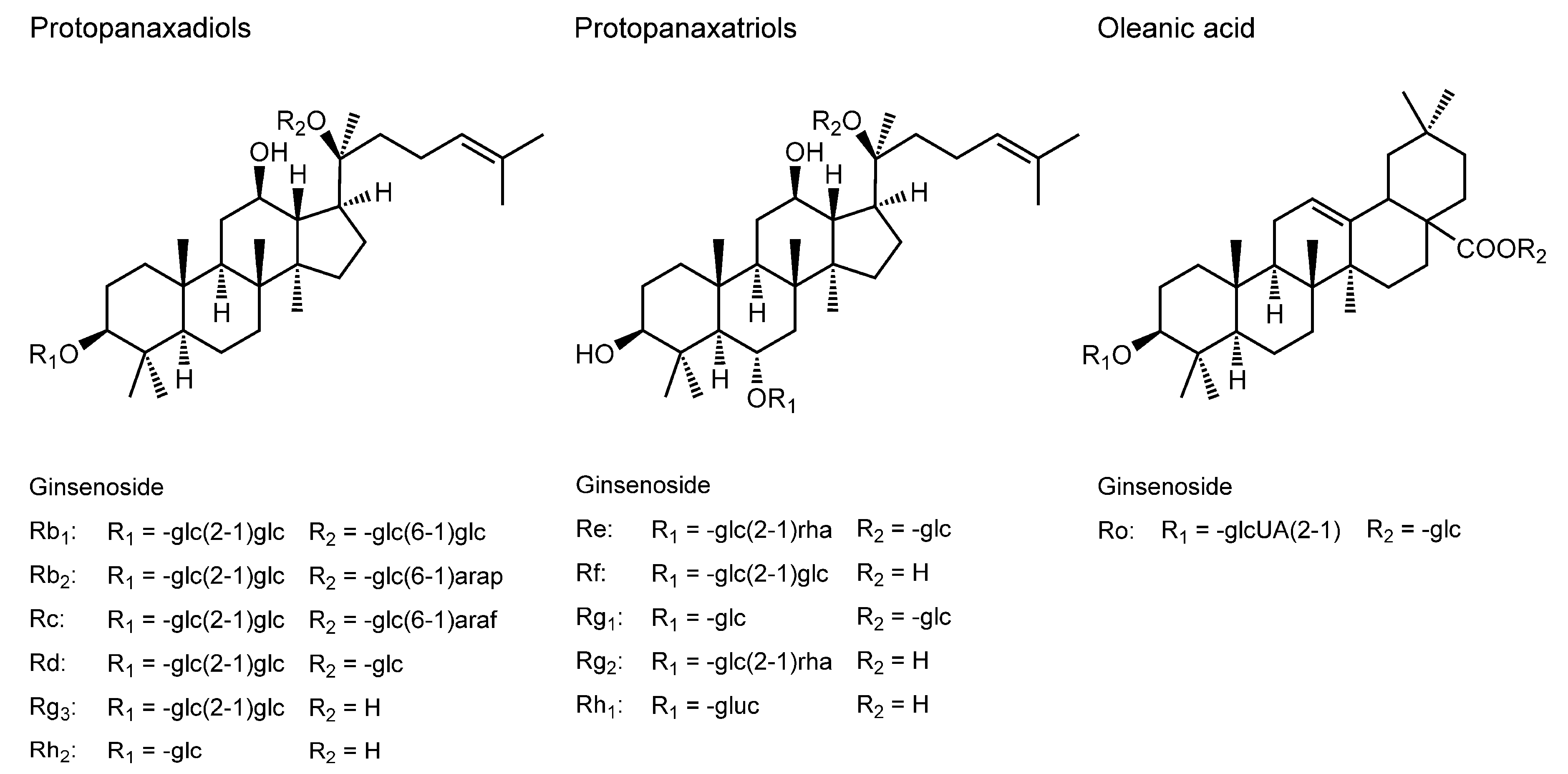 - Oh, H.J.; Shin, K.C.; Oh, D.K. Production of ginsenosides Rg1 and Rh1 by hydrolyzing the outer glycoside at the C-6 position in protopanaxatriol-type ginsenosides using β-glucosidase from Pyrococcus furiosus. Biotechnol. Lett. 2014, 36, 113–119. [Google Scholar] [CrossRef] [PubMed]