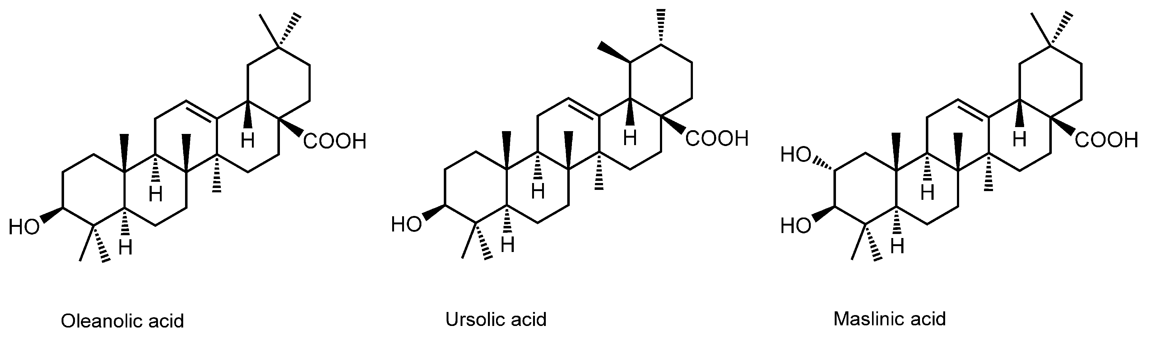 - Han, S.K.; Ko, Y.I.; Park, S.J.; Jin, I.J.; Kim, Y.M. Oleanolic acid and ursolic acid stabilize liposomal membranes. Lipids 1997, 32, 769–773. [Google Scholar] [CrossRef] [PubMed]