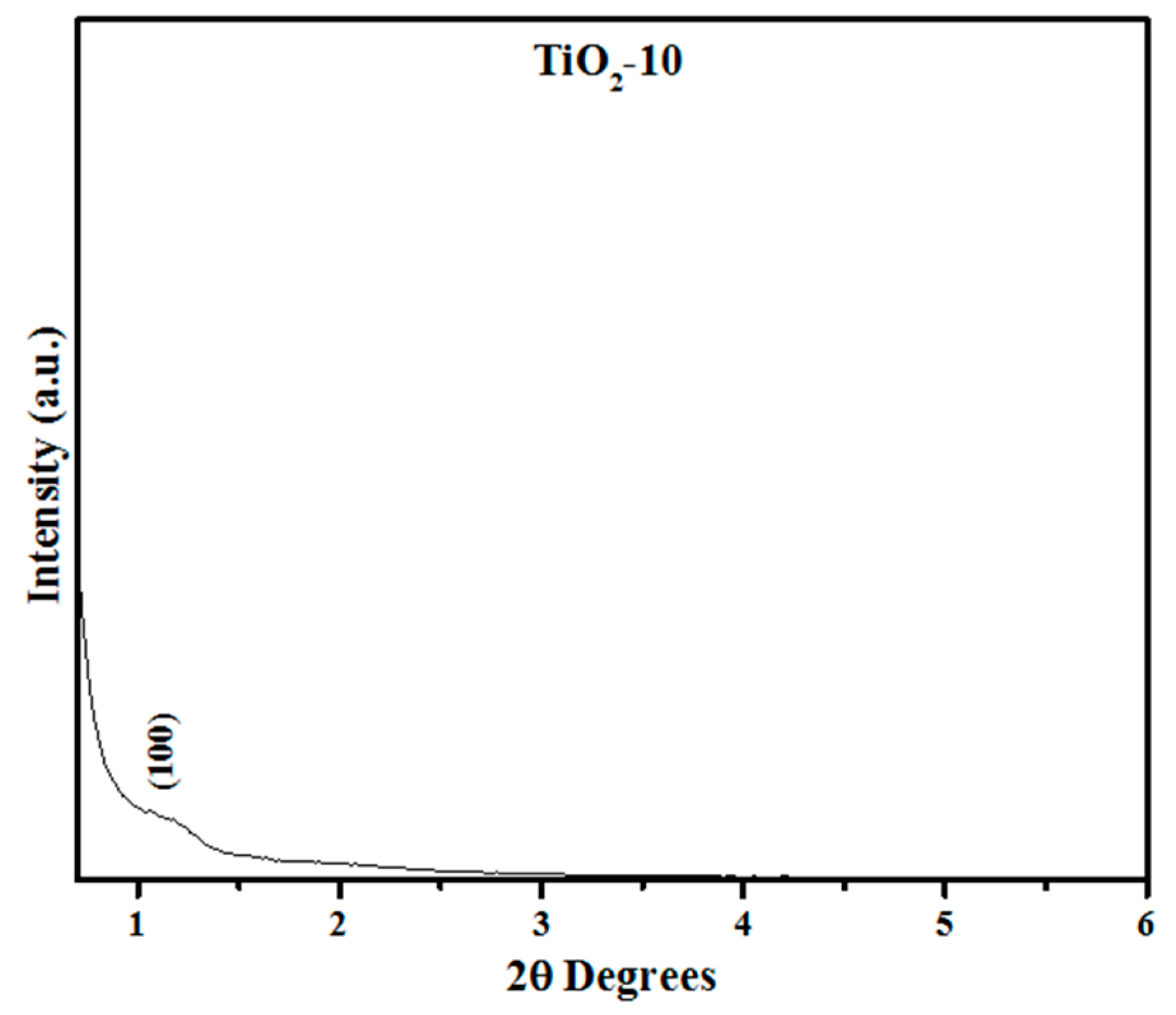 In addition, short range powder XRD was completed for the TiO2-10 material as shown in Figure 2. The short range XRD plot indicate a small peak at 2θ near 1.25° due to (100) plane, suggesting some pore ordering. This is supported later in the discussion related to Transmission Electron Microscopy (TEM) results in Section 2.1.4. The short range powder XRD data of the remaining materials (TiO2-8 TiO2-3, and TiO2-4) are shown in the Supplementary Materials in Figures S1–S3. The results indicate that the periodic arrangement of the pores is destroyed in these materials. Thus, the results suggest that a certain amount of titania loading is required for retention of pores. At an optimal loading amount, the titania particles provide a robust environment for retention of pores. When the loading of titania is relatively low, they do not coat the pore walls of SBA-15 completely and hence on calcination, the pores collapse.