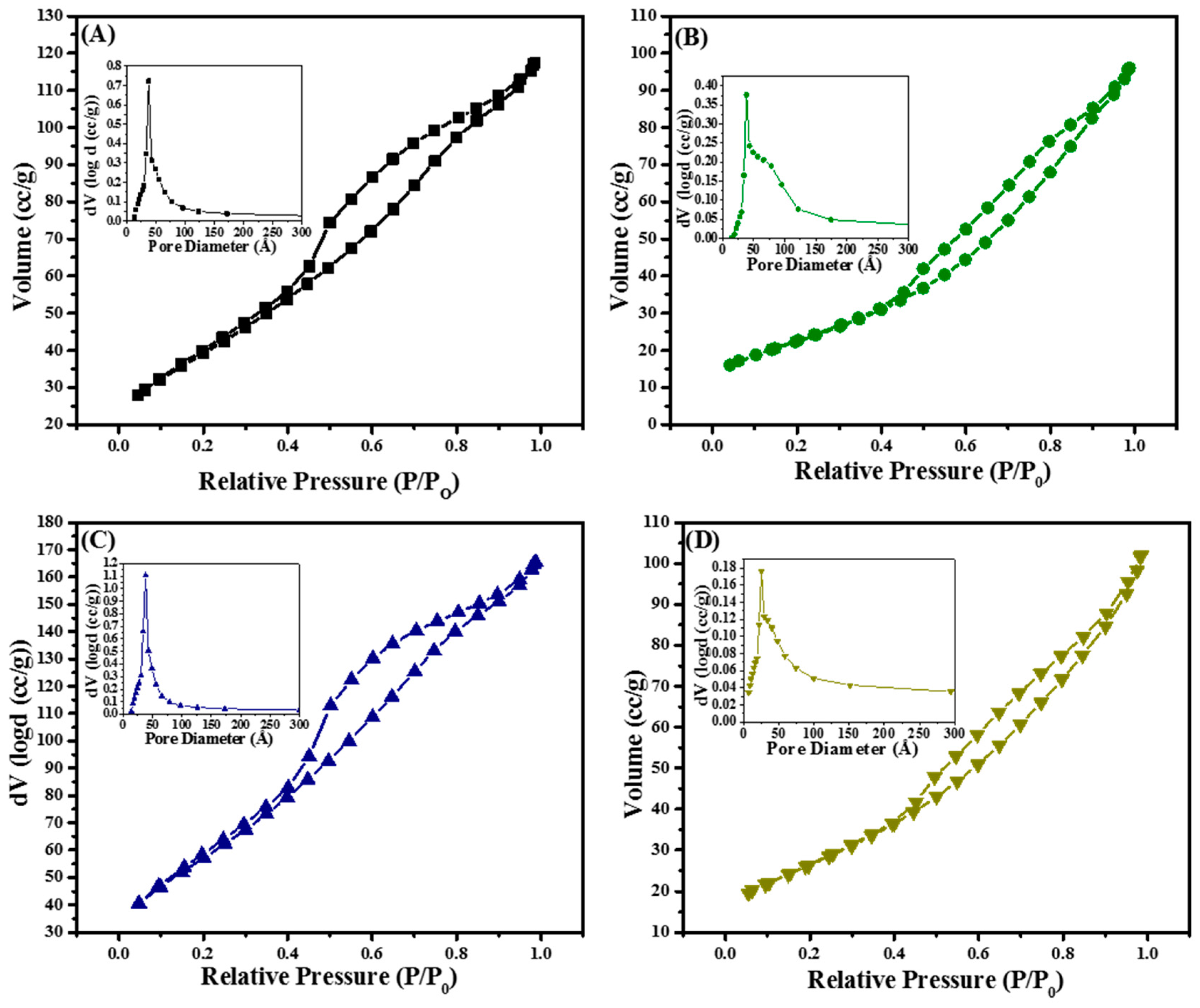 Nitrogen physisorption isotherms and Pore Size Distributions (insets) of hard templated mesoporous TiO2 (A) TiO2-10; (B) TiO2-8; (C) TiO2-3; and (D) TiO2-4 as function of cycles and titanium precursor.