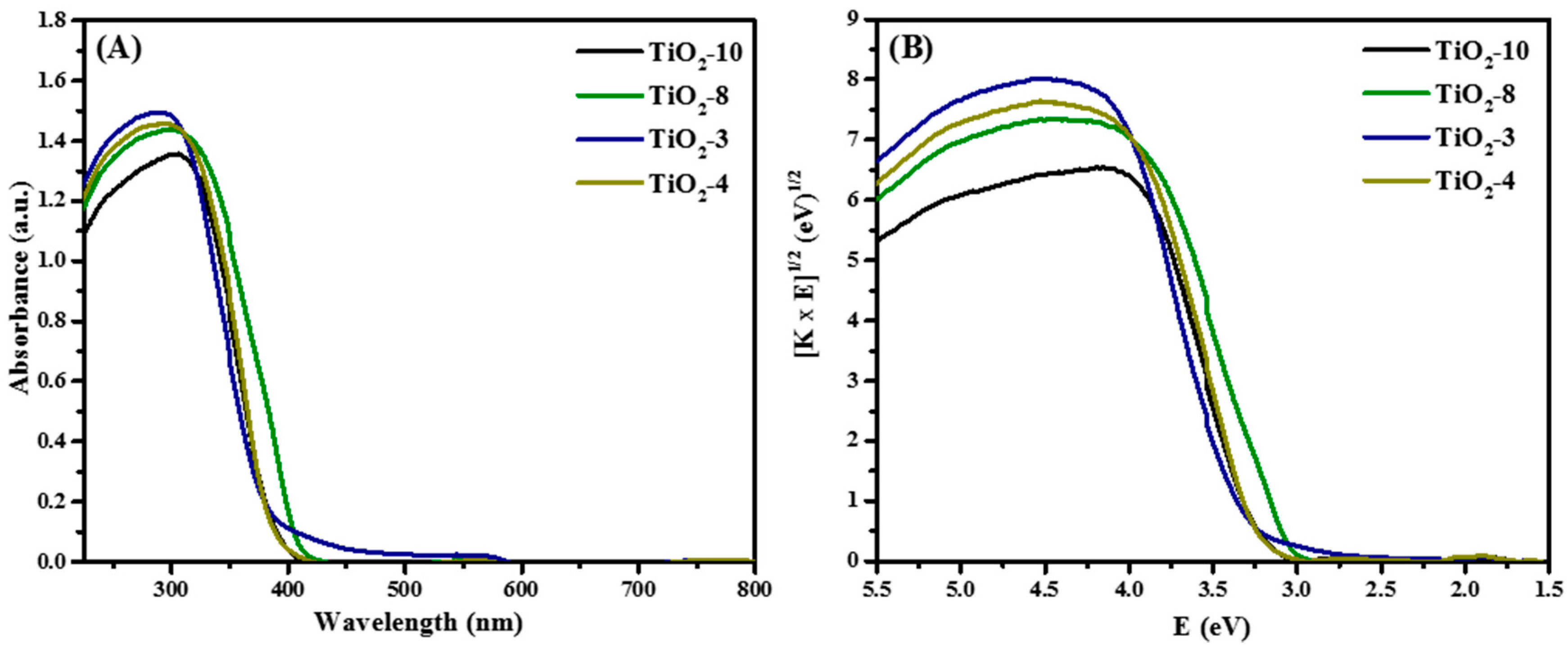 Diffuse reflectance spectroscopy was completed to determine the effects of the various phases on the bandgap. Figure 4A shows the absorbance plot. The corresponding Tauc plot is shown in Figure 4B. The strong absorption in the UV region (< 400 nm) are due to the optical band gap of TiO2, which typically lie in this region. The smallest bandgap was obtained for TiO2-8 material having anatase-rutile mixture, and this is consistent from the smaller bandgap of approximately 3.0 eV for rutile. The TiO2-10 and TiO2-4 had similar bandgap energies because they are composed of mainly anatase or exclusively anatase, with bandgaps of close to 3.2 eV. Greater amounts of TiO2(B) in TiO2-3 material with small crystallite size led to a larger bandgap of 3.35 eV. In addition, the crystallite sizes are consistent with the bandgap energies obtained, as shown in Table 1.
