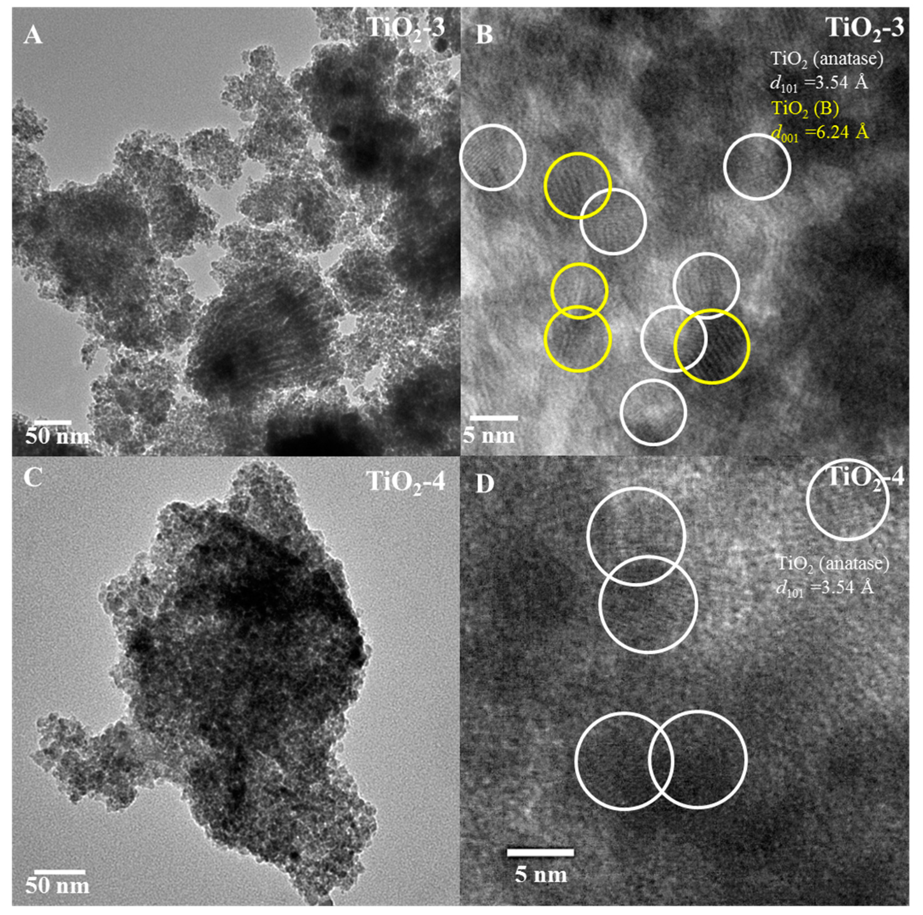 TEM images. TiO2-3 ((A) low magnification and (B) high magnification) and TiO2-4 ((C) low magnification and (D) high magnification) nanocasted titania mesoporous materials. The yellow and white circles indicate TiO2(B) and anatase phase respectively.