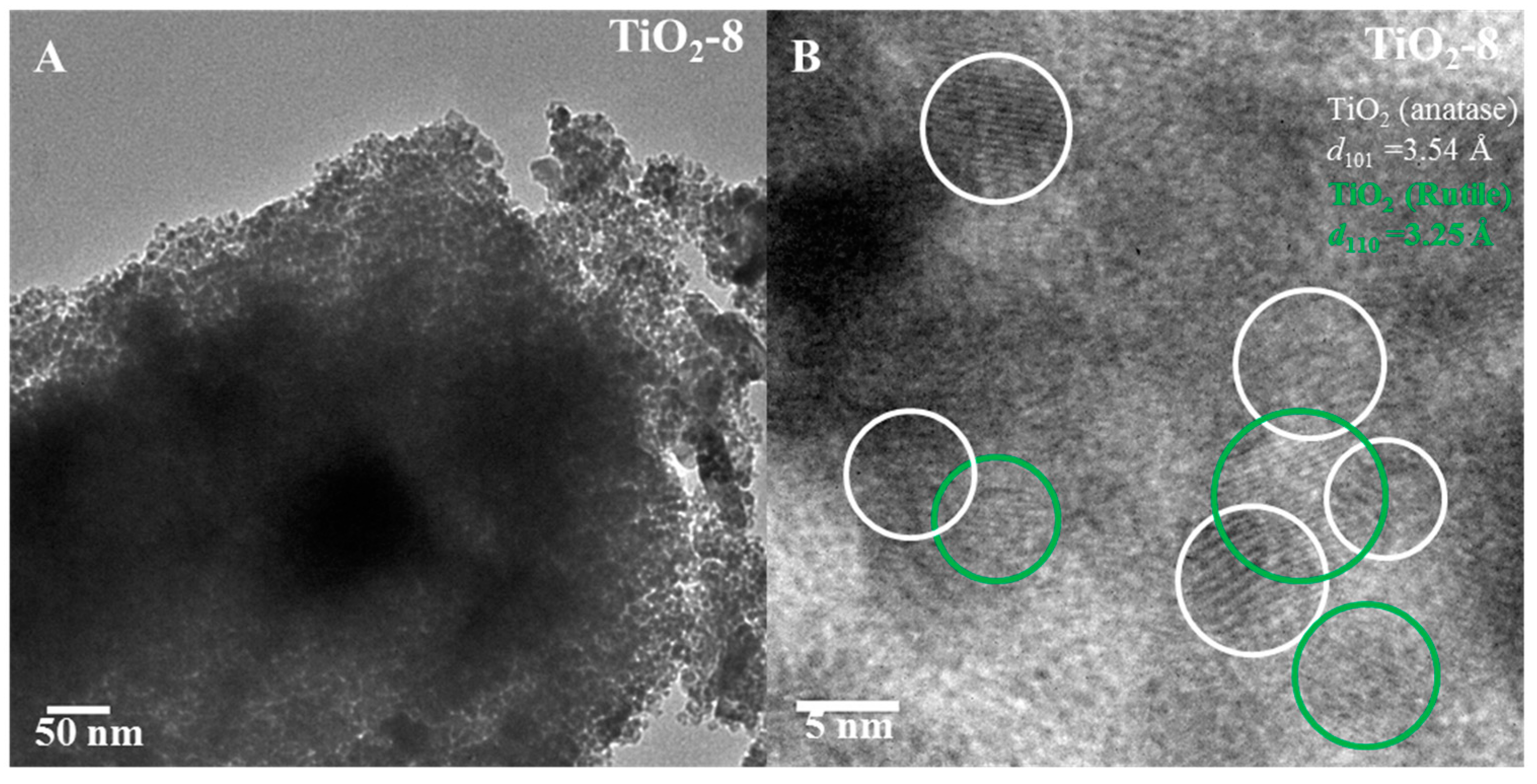 Figure 6A,B shows the TEM images of TiO2-8 material. The pore arrangement is random as indicated in Figure 6A. High magnification image indicates lattice fringes due to anatase (101) and rutile (110) with some heterojunction formation between the anatase and rutile phases.