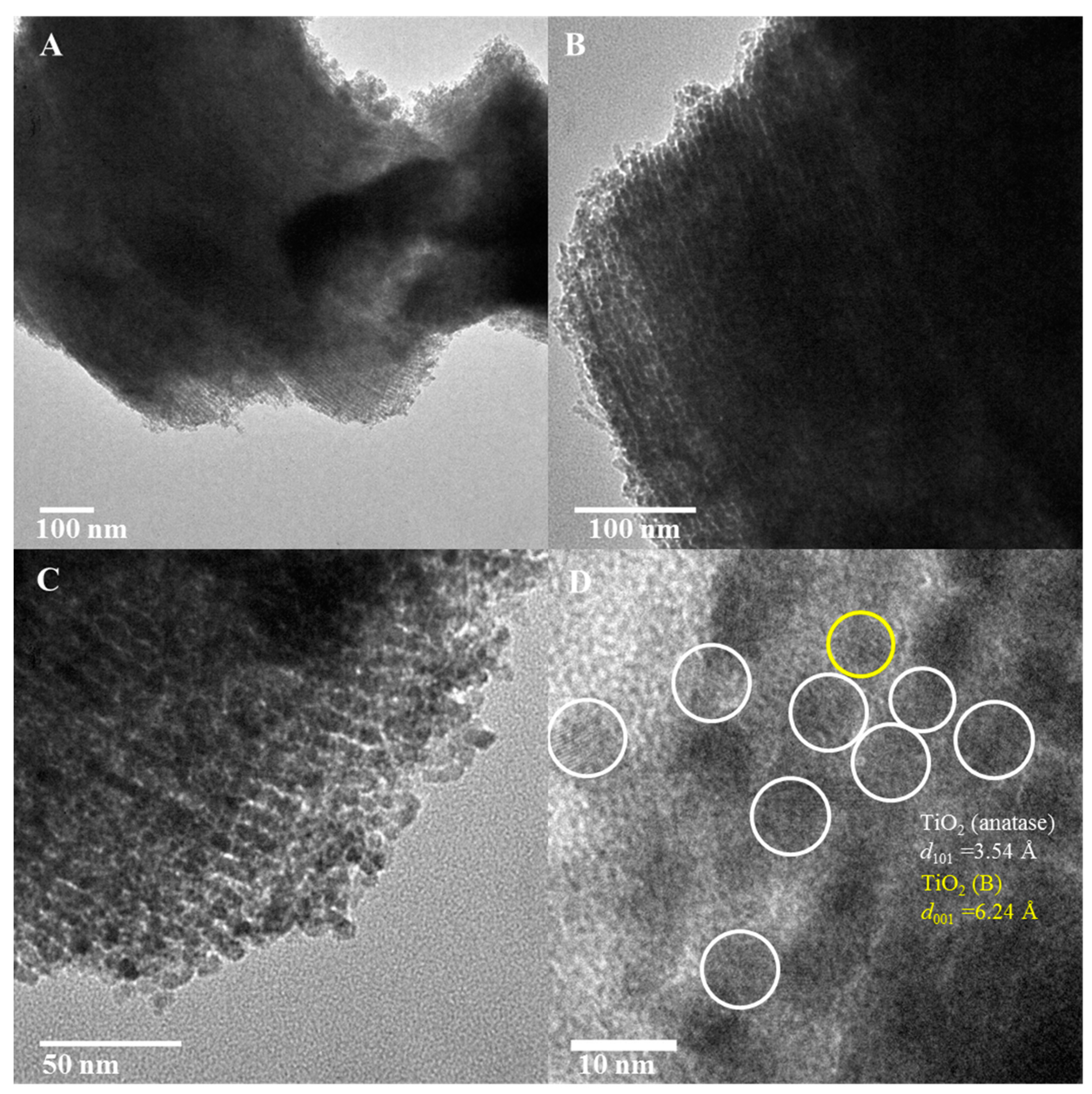 TEM of TiO2-10 ((A–C) low magnification and (D) high magnification) nanocasted titania mesoporous materials. The yellow and white circles represent TiO2(B) and anatase phase respectively.