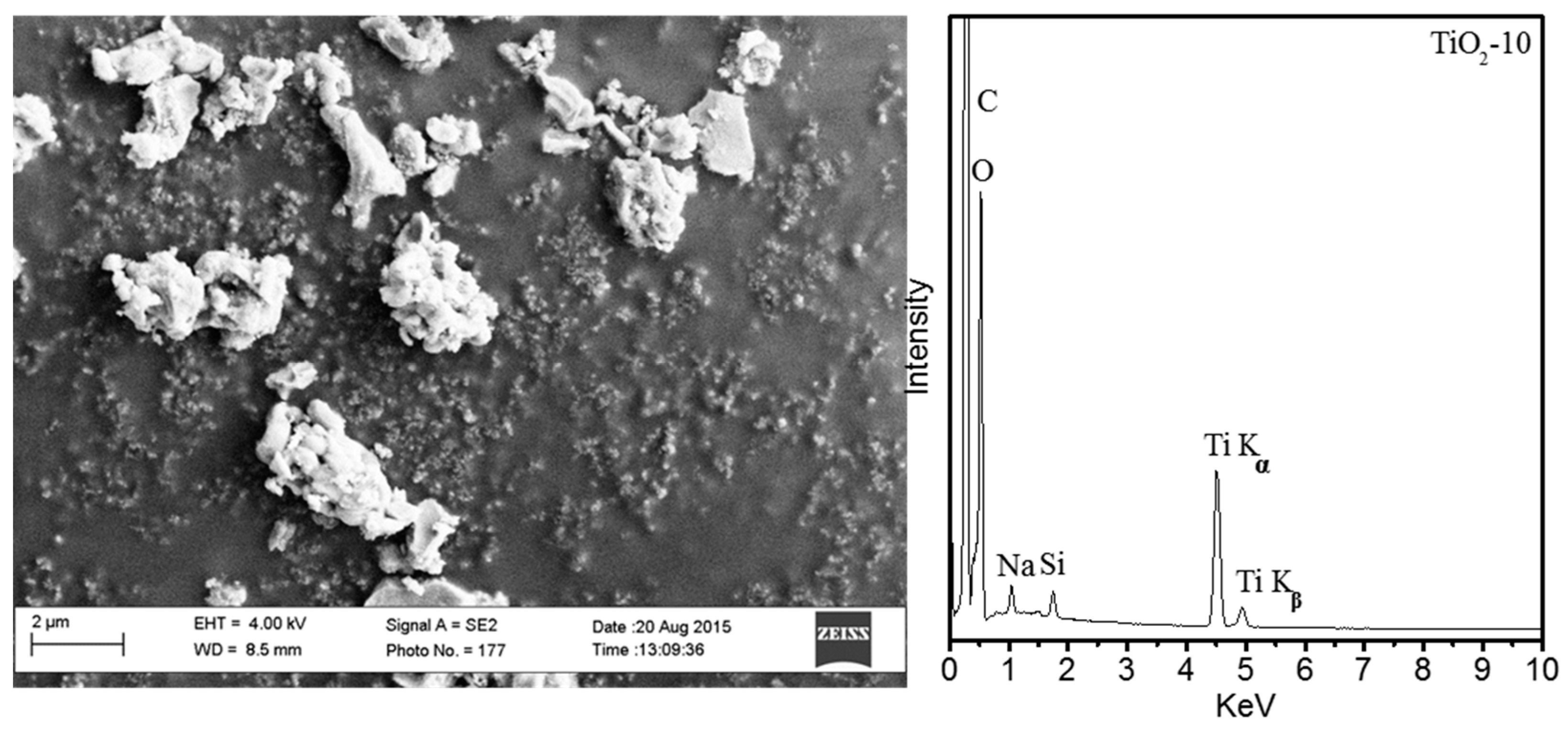 Figure 8 shows the scanning electron microscopy image of TiO2-10 with accompanying Energy Dispersive X-ray (EDX) mapping of this sample. The SEM image shows irregular morphology for the TiO2-10 material, and EDX mapping suggests a small amount of silica from the SBA-15 template after removing with NaOH aqueous solution. The retention of a small amount of silica is fairly common using the nanocasting method. Overall, the TEM and SEM analyses suggest TiO2-10 periodic unidirectional pore channels with globular morphology. The SEM of TiO2-3, -4, and -8 are shown in Figures S4–S6.