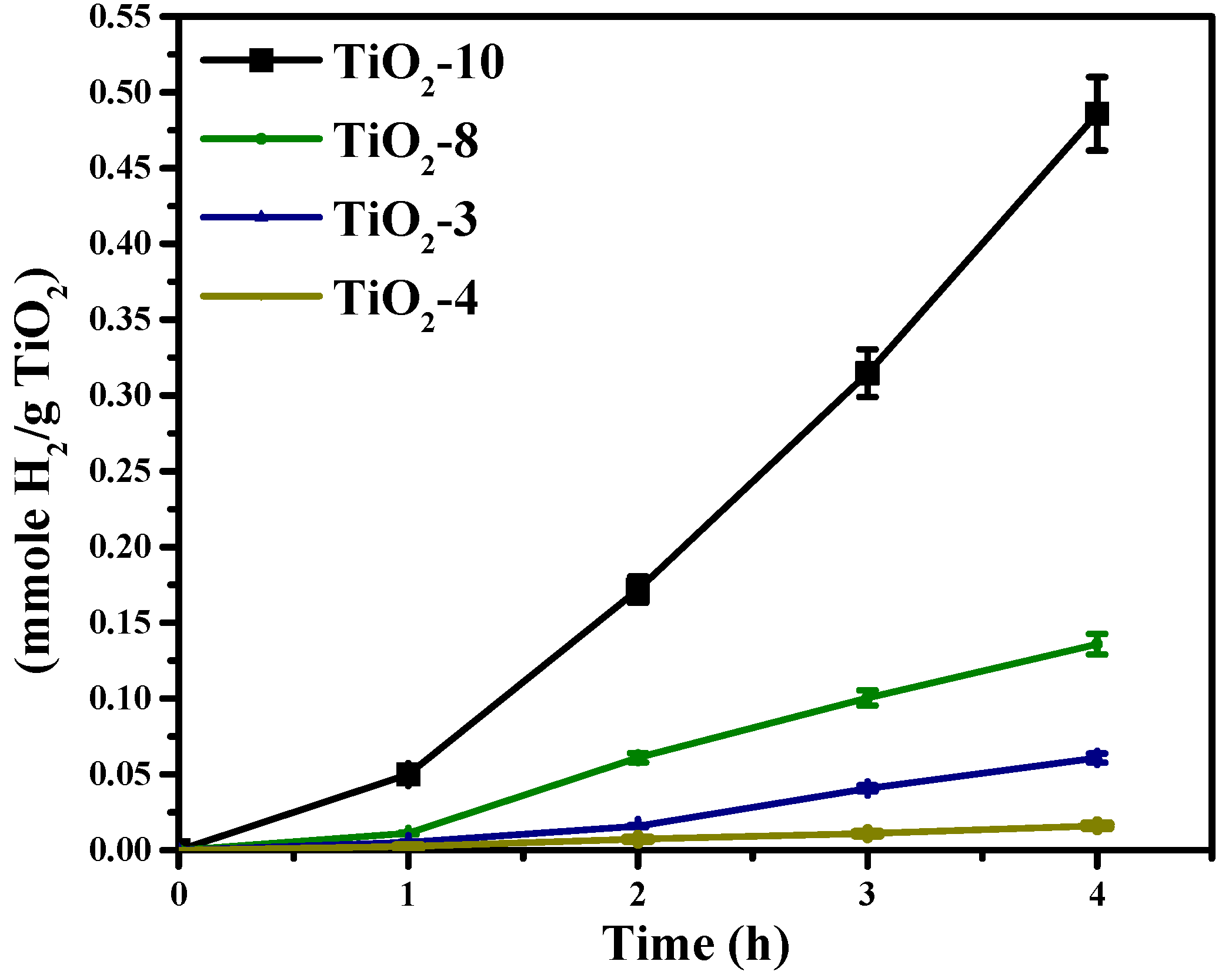 The photocatalytic activity for solar hydrogen production was evaluated for the nanocasted titania mesoporous materials and are shown in Figure 9. The photocatalytic activity was noted to be in the following order of TiO2-10 > TiO2-8 > TiO2-3 > TiO2-4. The materials made with titanium ethoxide had mixed phases, and the TiO2-4 material synthesized using titanium isopropoxide had only anatase phase. Therefore, the mixed phases may impart enhanced charge separation resulting in increased photocatalytic activity. Within the materials prepared using titanium ethoxide, TiO2-3 had 48% anatase and 52% TiO2(B) and TiO2-8 was found to have 75% anatase and 25% rutile content as indicated in Table 1. The TiO2-10 material was noted to have 98% anatase TiO2 and 2% TiO2(B).
