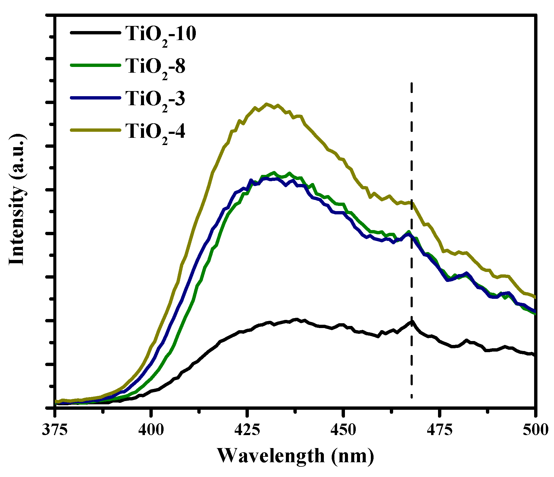 The phase(s) of titania appear to play a role in the solar hydrogen production photocatalytic activity. We endeavored to further understand the trends in photocatalytic hydrogen evolution. Therefore, photoluminescence studies were conducted on the four mesoporous materials as shown in Figure 10. All the samples show an intense peak that appears near 430 nm that is attributed to electron-hole recombination due to self-trapped excitons from all phase(s) of titania. In addition, small peaks can be seen near 467, 482, and 492 nm. The presence of oxygen defects can be inferred from the small peaks seen at approximately 467 nm, whereas the peaks at 482 and 492 nm may be attributed to surface states. These trap states will facilitate trapping charge carriers. The PL results supports the trends in photocatalytic activity previously shown in Figure 9. TiO2-4 material comprised solely of anatase and has the largest photoluminescence from increased electron-hole recombination, and correspondingly, the amount of hydrogen produced from this material is the lowest. The photoluminescence from TiO2-8 and TiO2-3 are similar. In comparing the photocatalytic activities, one notices that the amount of hydrogen produced is similar after 1 h of irradiation. On irradiation for longer durations of time, some difference is observed in the yield of hydrogen in these two materials. The photoluminescence signal from TiO2-10 was significantly lower in comparison to the rest of the mesoporous materials, and this suggests significantly reduced electron-hole recombination. This is consistent with the relatively high photocatalytic activity obtained for this material. In summary, the photoluminescence studies validate the trends observed in photocatalytic production of hydrogen.