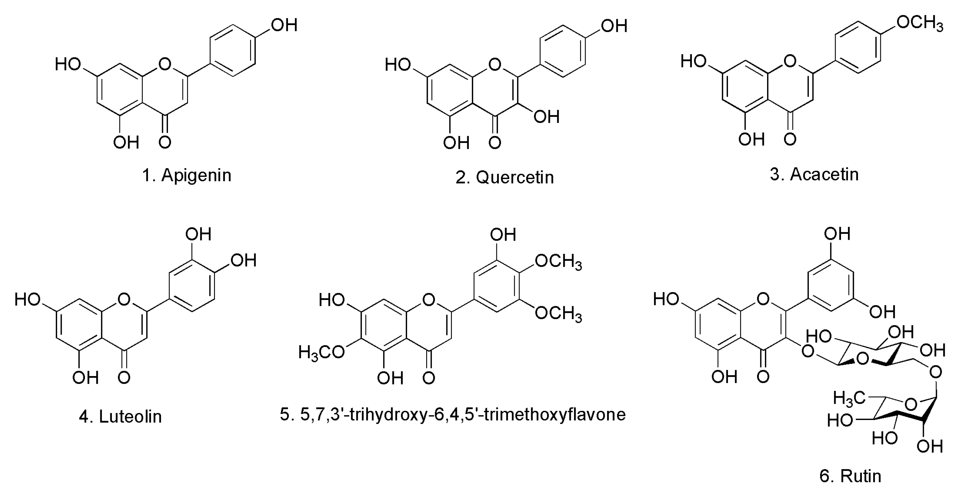 The chemical investigation of the EtOAc extracts of the aerial parts of Lycium chinense Mill (LCA) led to the isolation and identification of six compounds (Figure 1). These compounds were identified with the aid of complete spectroscopic analyses, including UV, IR, MS and NMR spectroscopy and by comparing their spectral data with those of previously reported in the literature. The compounds are apigenin, quercetin, acacetin, luteolin, 5,7,3′-trihydroxy-6,4,5′-trimethoxyflavone and rutin. In addition to the isolated compounds, HPLC-ESI-MS analysis of the LCA extracts indicated the presence of additional compounds identified as kaempferol, coumaric acid, ferulic acid and vanillic acid.