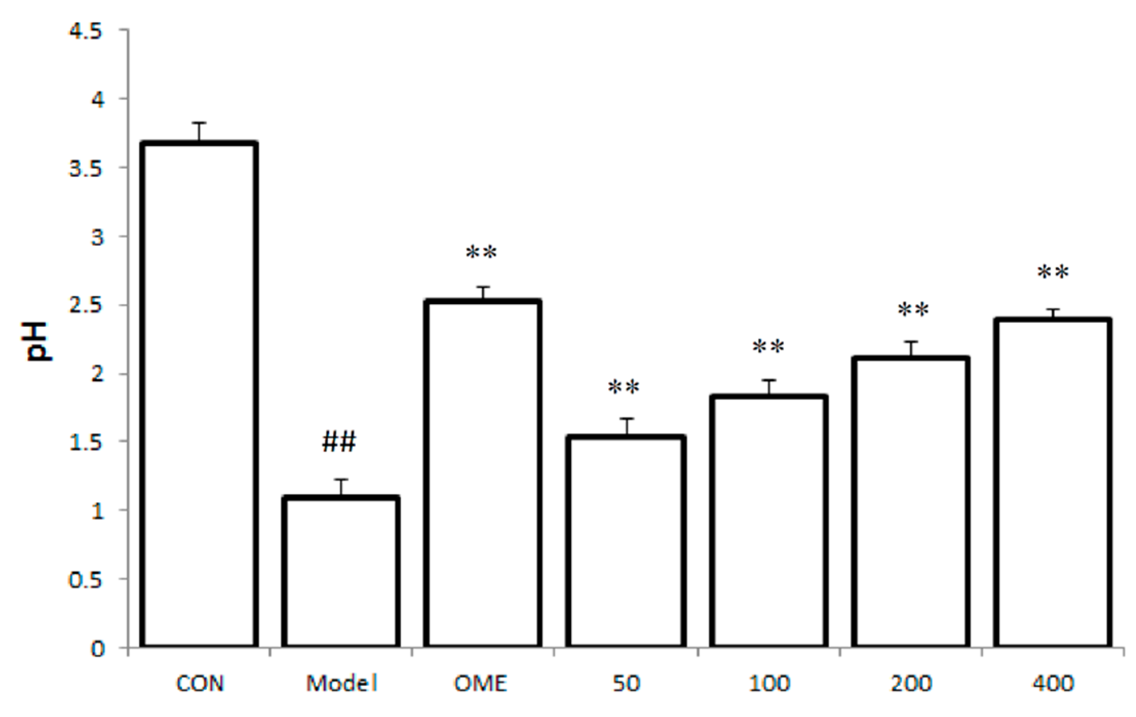 Effect of LCA on gastric juice acid content (pH). Data are expressed as the mean ± SD (n = 8). ##: p < 0.01 vs. control group. **: p < 0.01 vs. model group. (CON = control; OME = omeprazole).