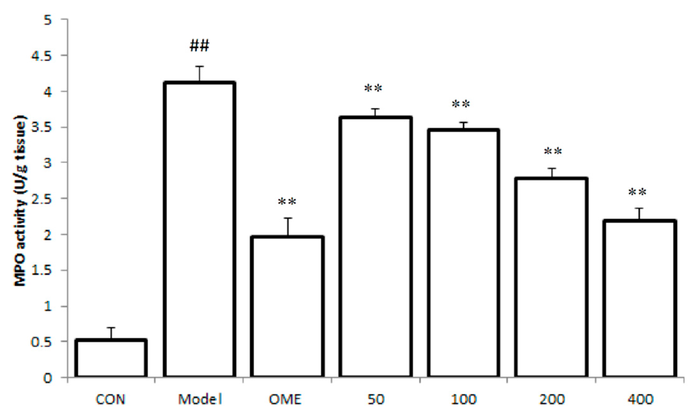 Effect of LCA on MPO activity. Data are expressed as the mean ± SD (n = 8). ##: p < 0.01 vs. control group. **: p < 0.01 vs. model group. (CON = control; OME = omeprazole).