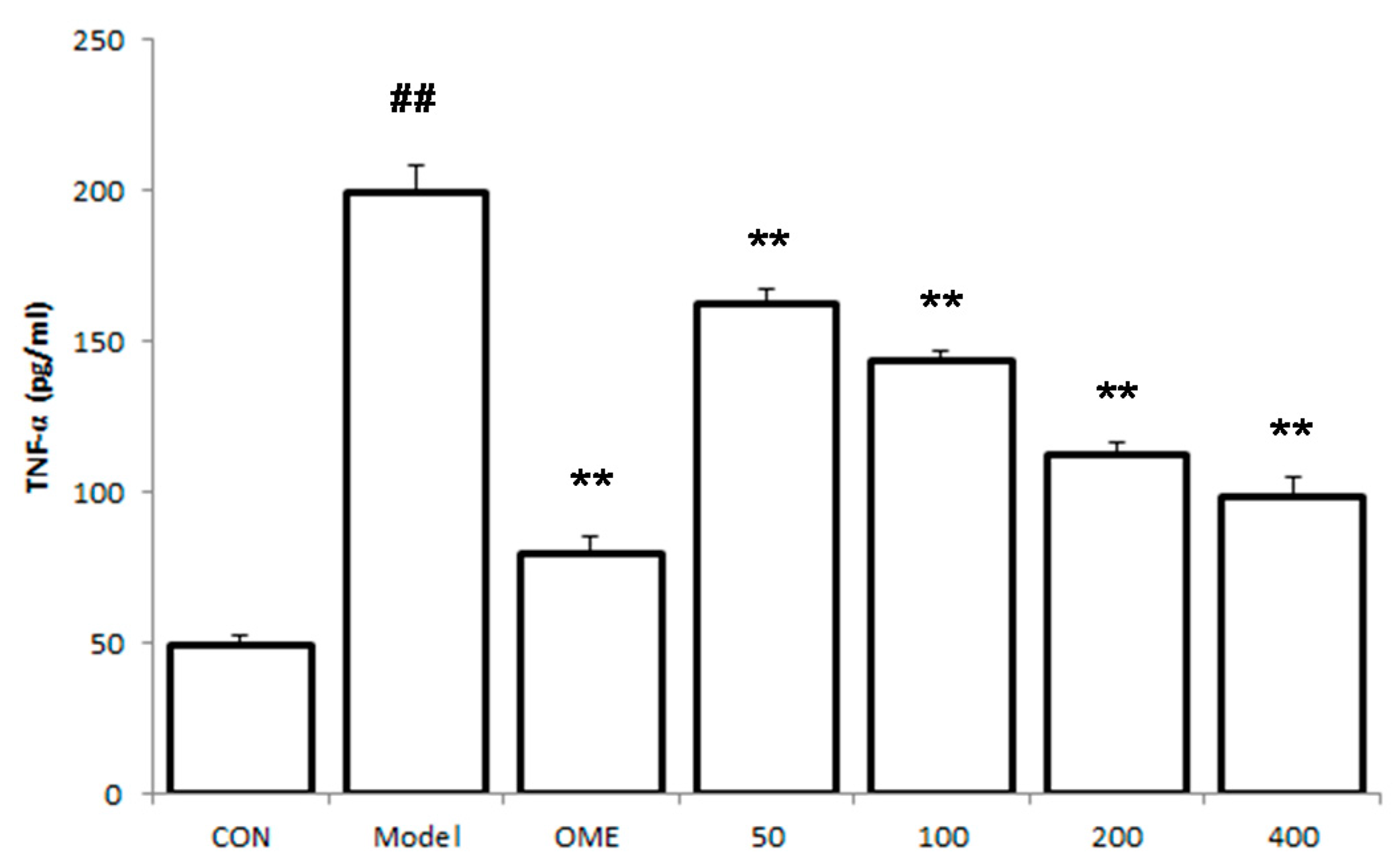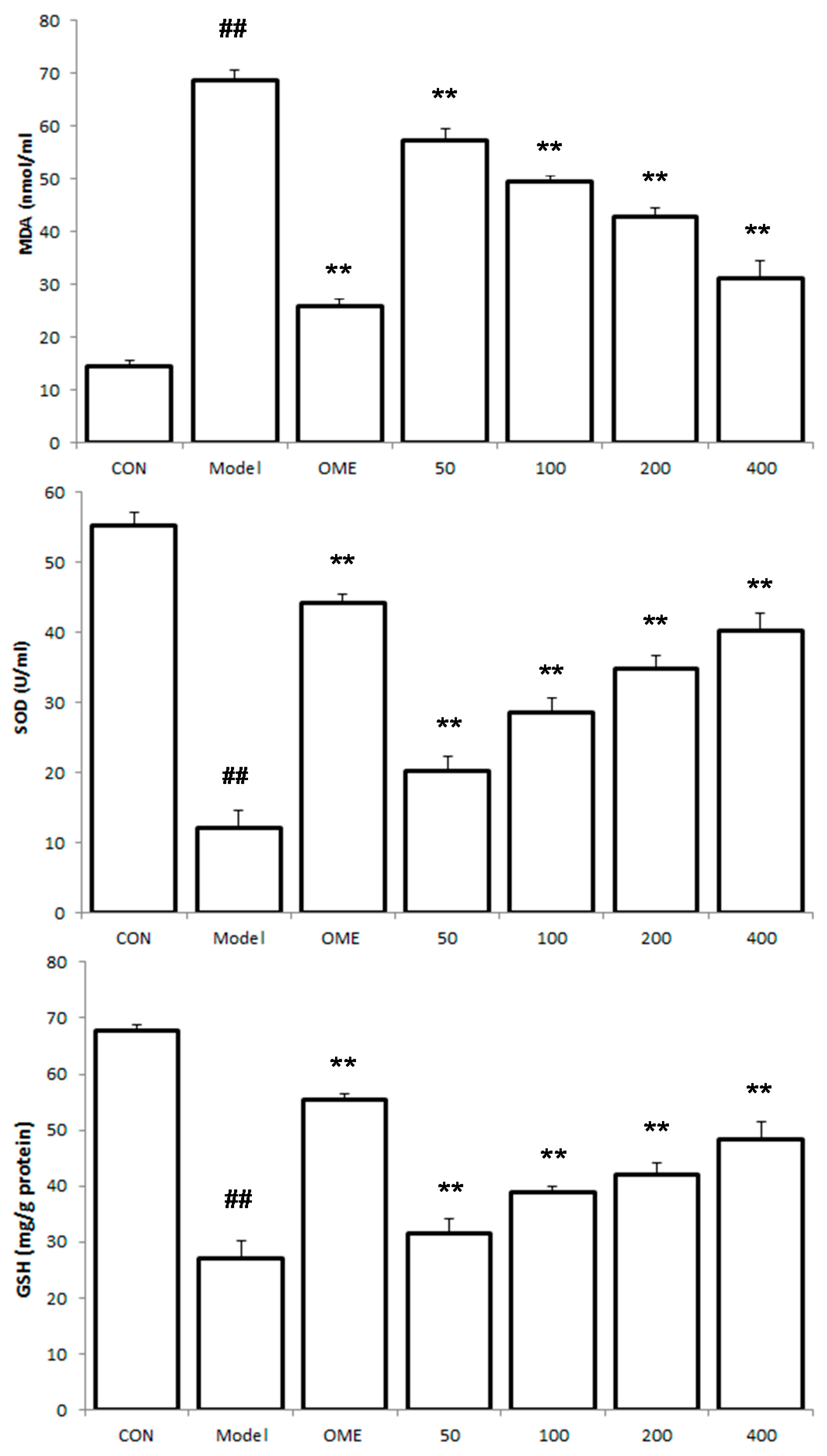 The values are expressed as mean ± SEM and analyzed by ANOVA followed by Tukey test. ##: p < 0.01 vs. control group. **: p < 0.01 vs. model group. Epithelial cell loss (score: 0–3), edema in the upper mucosa (score: 0–4), hemorrhagic damage (score: 0–4), and the presence of inflammatory cells (score: 0–3), yielding a maximum total score of 14.