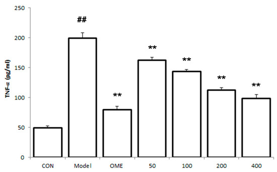 Effects of LCA on cytokine levels in the serum. Data are expressed as the mean ± SD (n = 8). ##: p < 0.01 vs. control group. **: p < 0.01 vs. model group. (CON = control; OME = omeprazole).