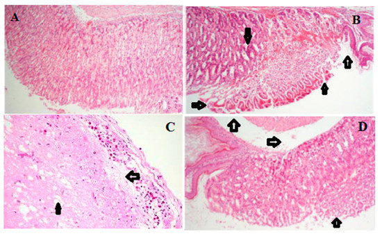 The glandular stomach was fixed in 10% formalin solution for 24 h, sectioned and embedded in paraffin. A 5 mm thick section of the stomach was deparaffinized, stained with hematoxylin-eosin and was examined under a light microscope. Specimens were further evaluated based on previously described specification [32]. In brief, a 1 cm portion of each histological section was analyzed for epithelial cell loss (score: 0–3), edema in the upper mucosa (score: 0–4), hemorrhagic damage (score: 0–4), and the presence of inflammatory cells (score: 0–3), giving a total score of 14. Thereafter, the evaluation of the sections were performed by a pathologist who has no prior information as regards the treatment.