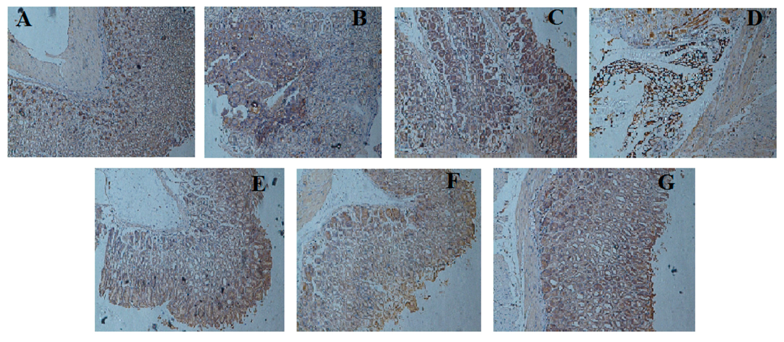 Immunohistochemical staining for the determination of NF-κBp65 protein expression in gastric mucosa. (A) Control; (B) model; (C) ethanol + OME 20 mg/kg; (D) ethanol + LCA 50 mg/kg; (E) ethanol + LCA 100 mg/kg; (F) ethanol + LCA 200 mg/kg; (G) ethanol + LCA 400 mg/kg. (Original magnification 100×).