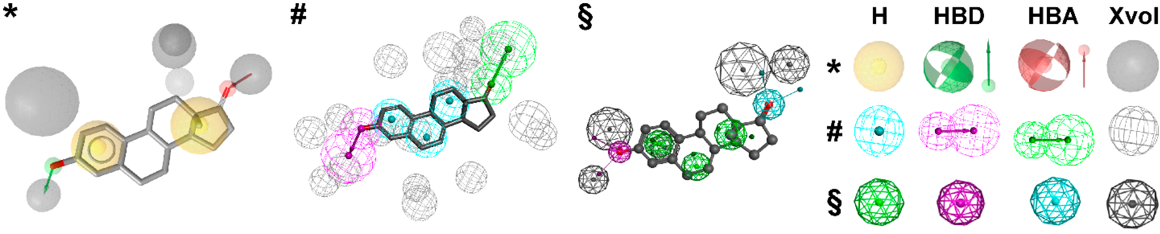 Pharmacophore models based on the estrogen equilin co-crystallized with 17β-hydroxysteroid dehydrogenase type 1 (PDB entry 1EQU [5]) and generated with LigandScout [6] (*), Discovery Studio [7] (#), and Molecular Operating Environment (MOE) [8] (§). H, hydrophobic feature; HBD, hydrogen bond donor; HBA, hydrogen bond acceptor; XVols, exclusion volume.