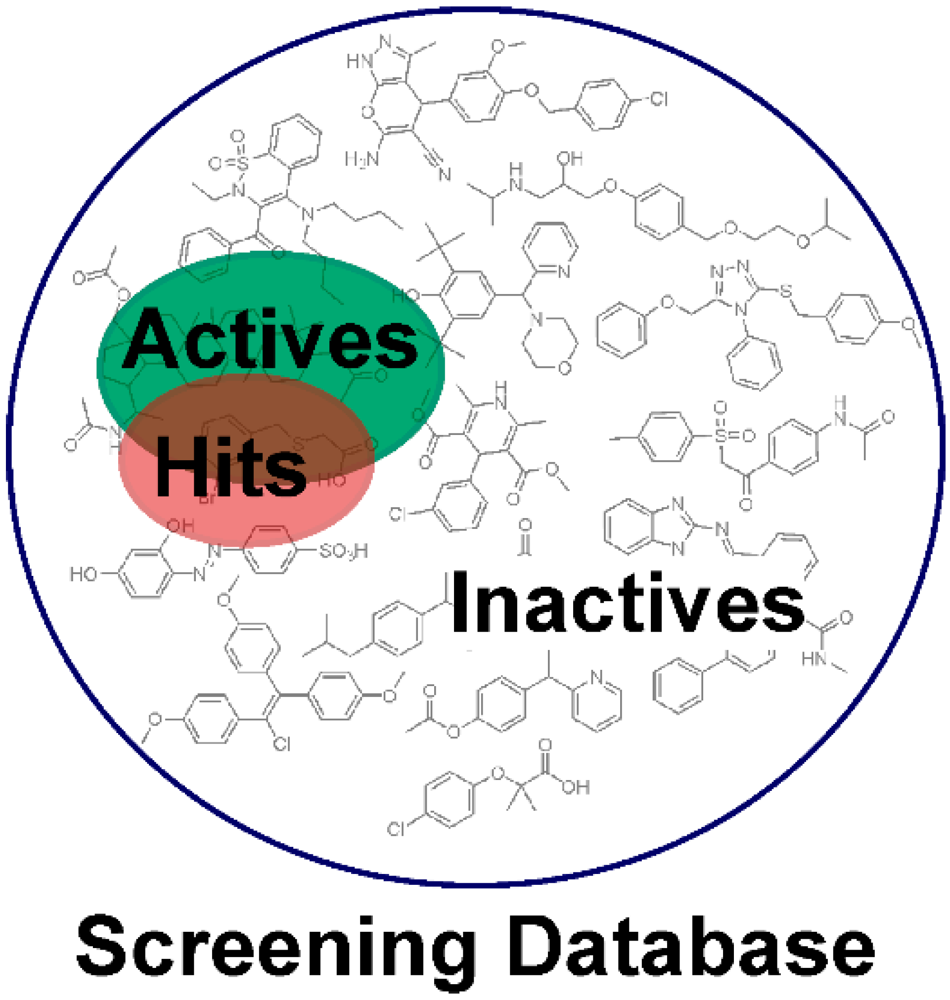 Enrichment of active molecules in the virtual hit list. Usually, the majority of compounds in a screening database are inactive molecules, while a small pool of bioactive molecules is contained. Pharmacophore-based virtual screening can help to enrich active molecules in the hit list compared to a random selection of test compounds.