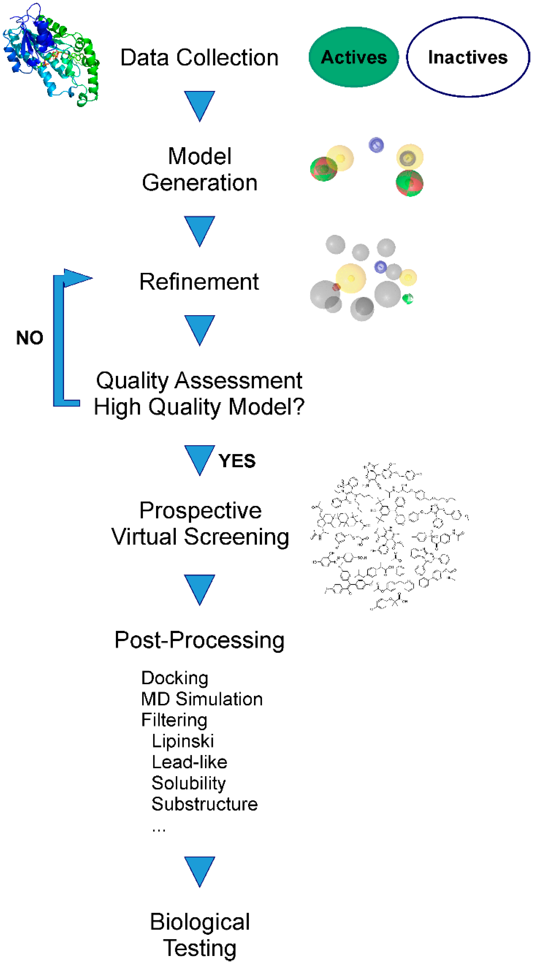 The different consecutive steps in pharmacophore model generation, refinement, and prospective application.