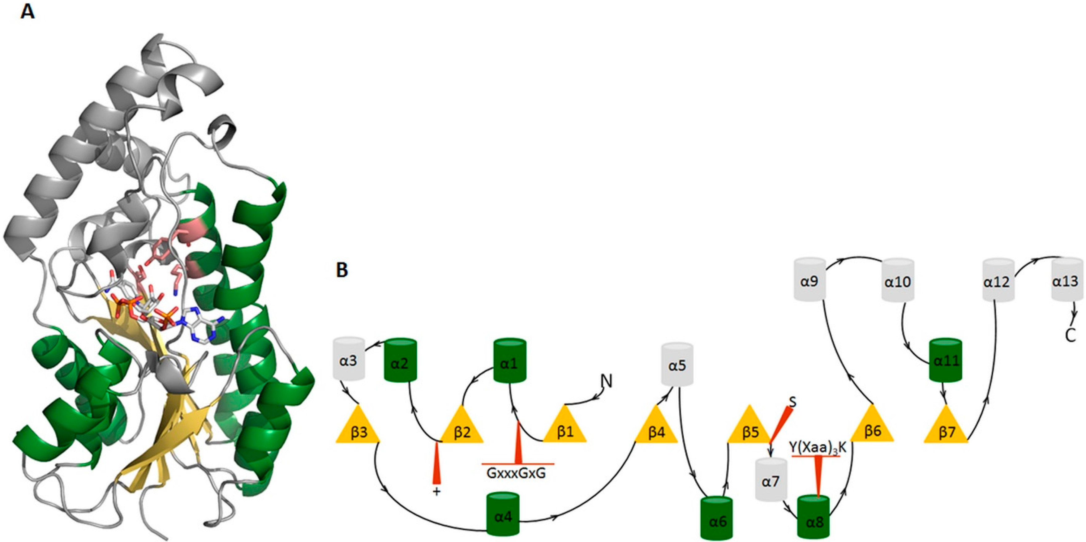 The general structure of SDR enzymes exemplified on 17β-HSD1 (PDB entry 1EQU [5]). (A) The Rossmann fold consists of parallel stranded β-sheets (yellow), which are flanked by α-helices on both sides (green). This structural domain forms the binding site of the co-factor NADP+. The residues Tyr155 and Lys159 of the Tyr-(Xaa)3-Lys motif as well as the conserved Ser142 are highlighted in rose; (B) 2D depiction of 17β-HSD1 (PDB entry 1EQU). Yellow triangles display β-sheets and barrel symbols α-helices. Apart from the Rossmann fold, structurally conserved regions are highlighted in red. The conserved glycine-rich motif GxxxGxG is important for cofactor binding and the + indicates a positive charged residue crucial for cofactor (NADP+) stabilization.