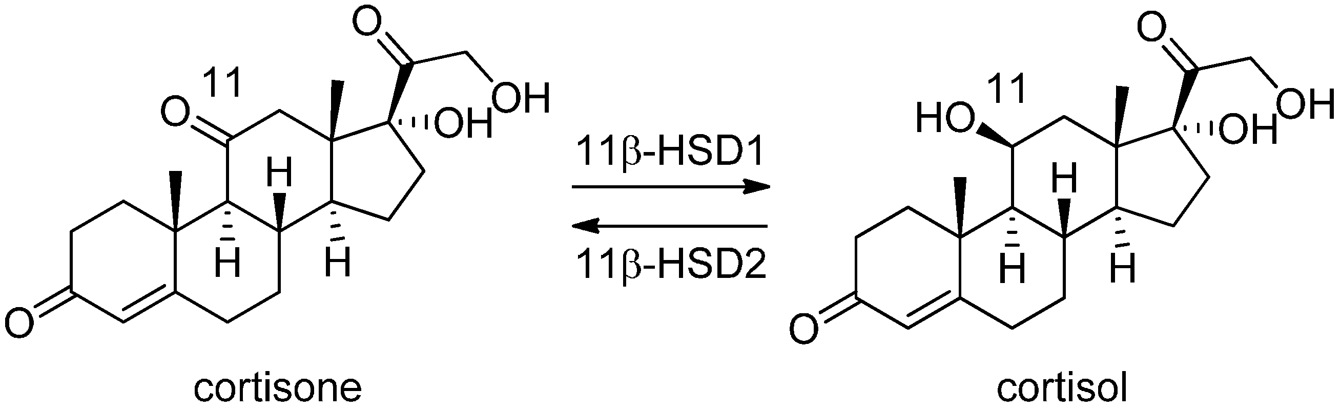 Interconversion of cortisone and cortisol catalyzed by the 11β-HSD enzymes.