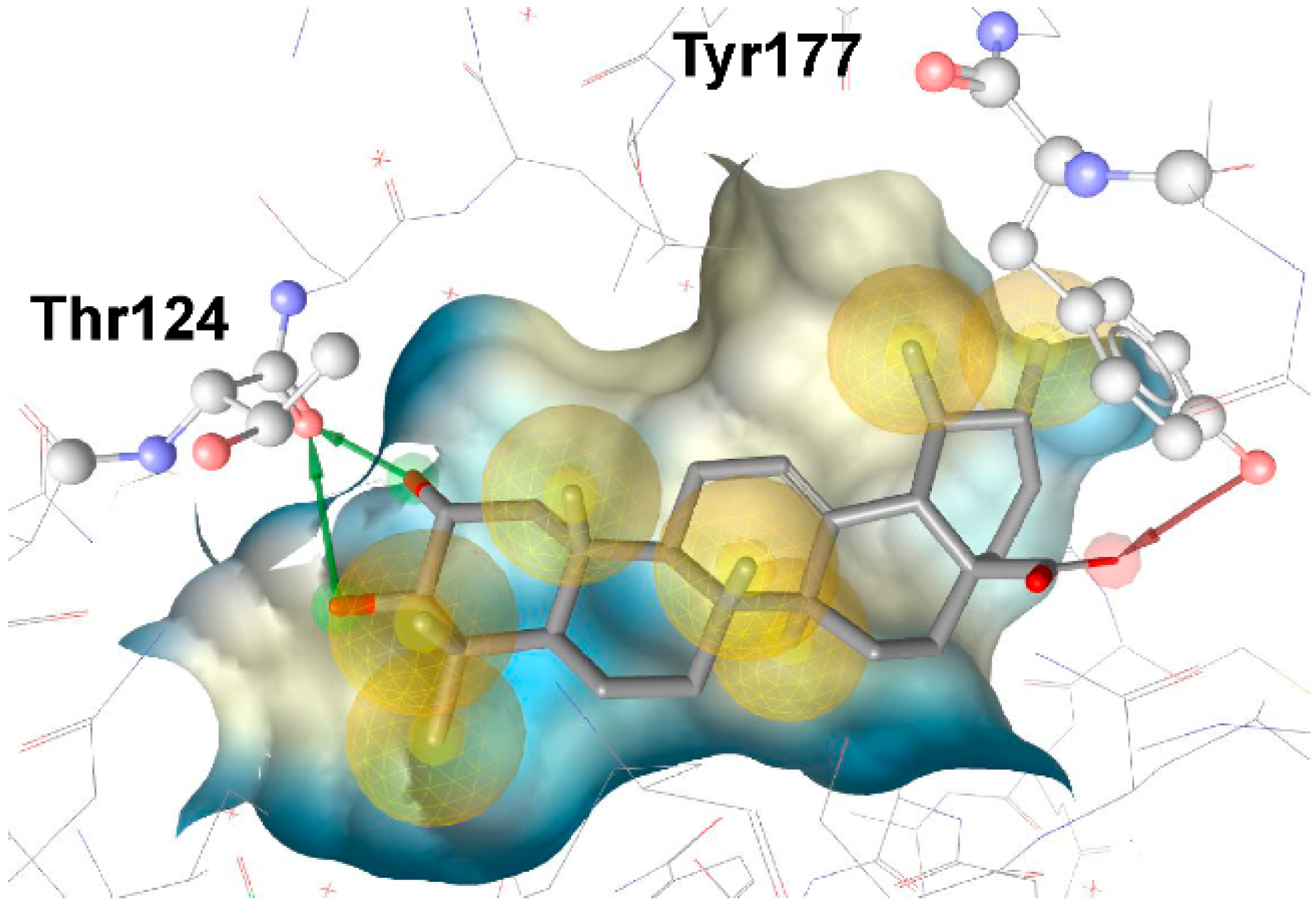 The docking pose of the potent inhibitor corosolic acid in the binding pocket of 11β-HSD1 (PDB entry 2BEL [110]) suggests interactions with Thr124 and Tyr177.