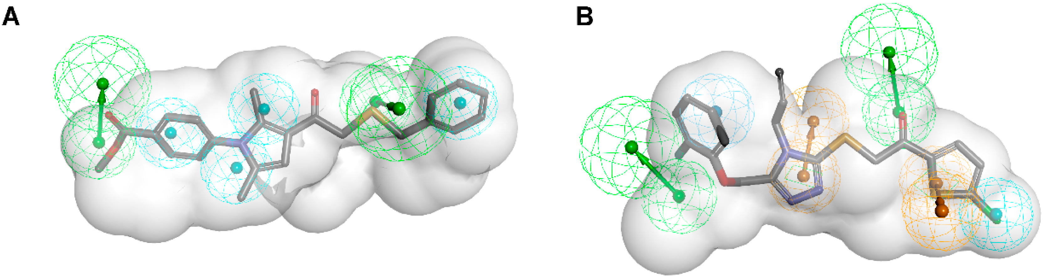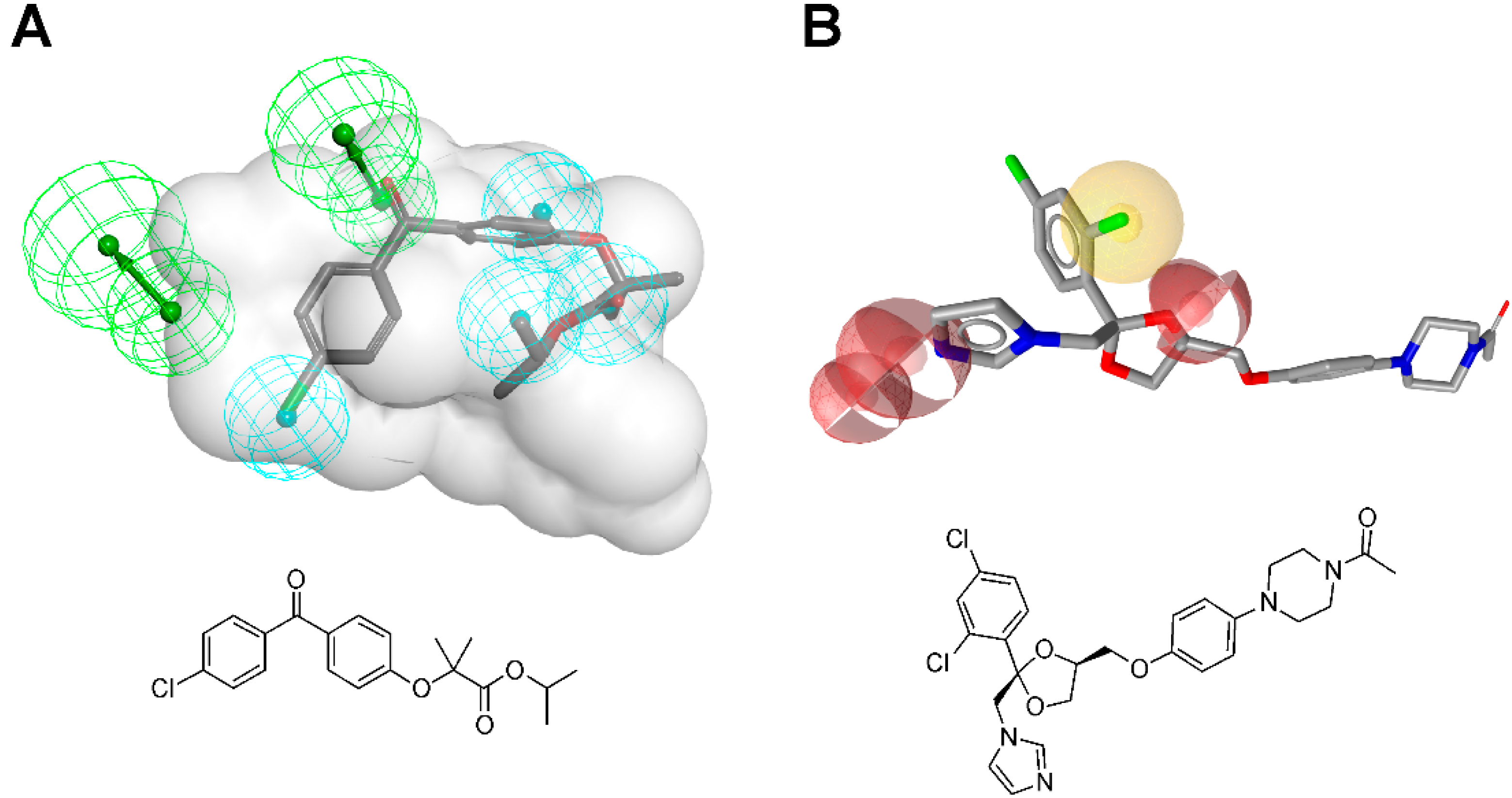 Both the refined 11β-HSD1 (A) and 11β-HSD2 (B) model identified novel scaffolds [29]. The inhibitor fenofibrate maps the 11β-HSD1 model (A) and ketoconazole matches the 11β-HSD2 model (B). Both models were screened with one omitted feature. The 2D structures of the novel inhibitors are depicted underneath the alignments.