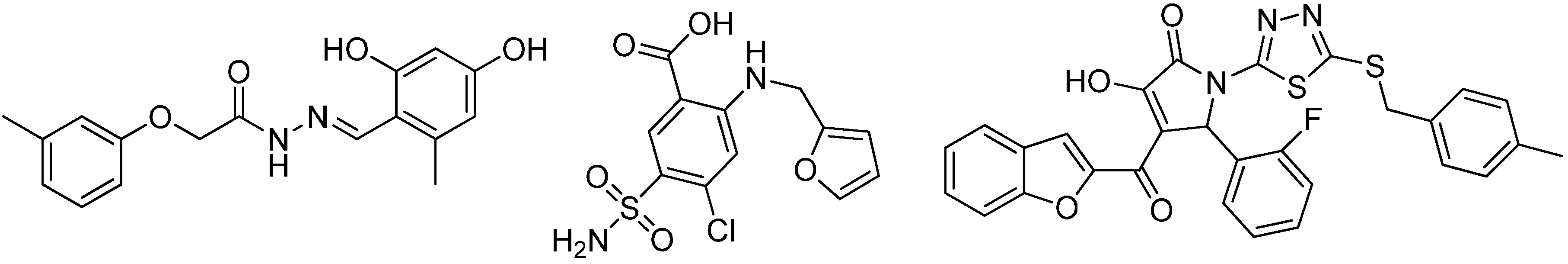 | 11β-HSD2 selective | In-house database, Specs, Maybridge | ![]() ketoconazole | 444 | 25 | 2 | 11%–61% Enzyme rest activity | One preferentially inhibited 11β-HSD1 and one was unselective | ||