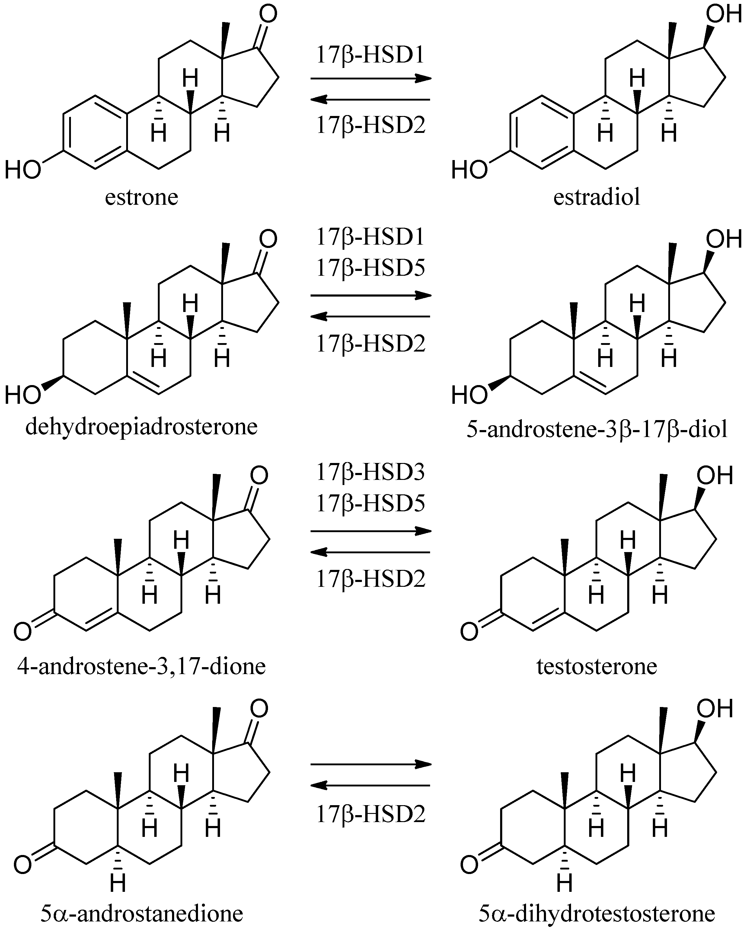 The enzyme 17β-HSD1 catalyzes the NADP (H)-dependent reduction of the weak estrogen estrone to the potent estradiol and to a minor extent of dehydroepiandrosterone (DHEA) to 5-androstene-3β,17β-diol [121]. 17β-HSD1 is predominantly expressed in the human placenta, ovaries, and mammary gland, and is of major importance for the peripheral and gonadal estradiol synthesis [122]. Several studies provide evidence for the association of 17β-HSD1 with breast cancer [123,124,125], endometriosis [52,126], endometrial cancer [127] and uterine leiomyoma [128].