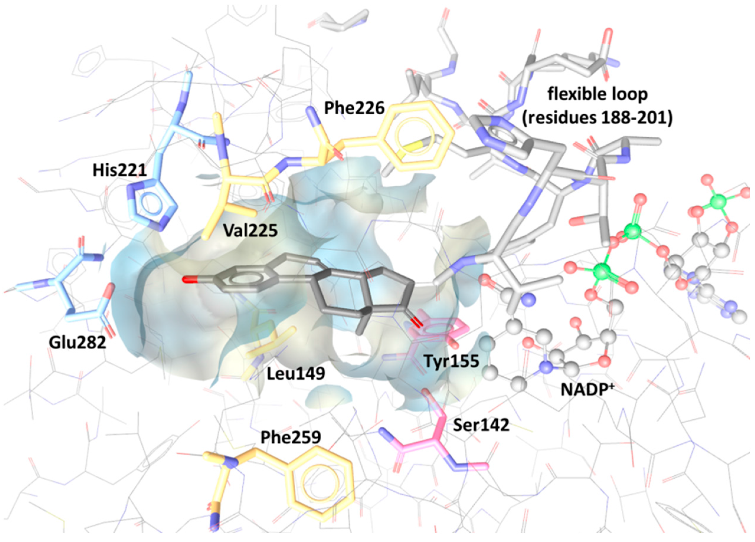 Despite the recently increasing numbers of reported 17β-HSD1 inhibitors, still no compound reached clinical trials. To date, more than 20 crystal structures have been published. The binding pocket of 17β-HSD1 is an elongated hydrophobic tunnel, with key roles for Leu149, Val225, Phe226, and Phe259, and polar areas at each end formed by His221 and Glu282 on one side and the catalytically essential residues Ser142 and Tyr155 on the other side. The active site is limited by a flexible loop (amino acids 188–201), which is not well resolved in the crystal structures (Figure 12) [13].