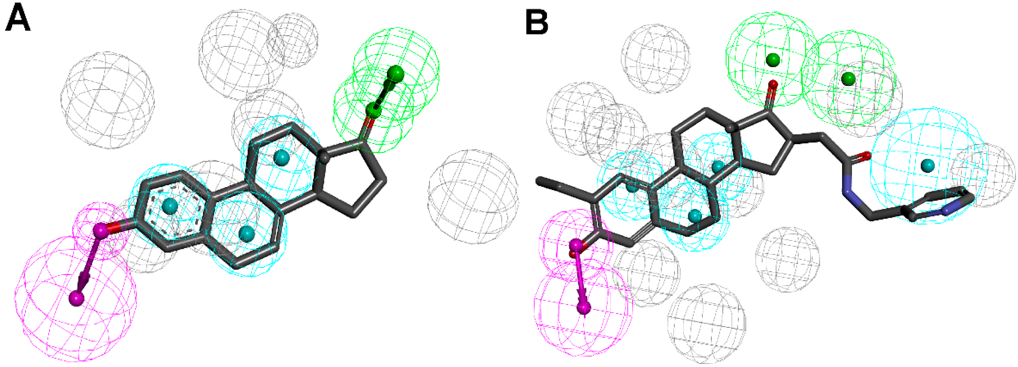 (A) Structure- and (B) ligand-based pharmacophore model generation with LigandScout. (A) Based on the complex of equilin bound to 17β-HSD1 (PDB entry 1EQU [5]), an initial pharmacophore model is created automatically; (B) Conformational models of known 17β-HSD1 ligands [13,14] are used to align the compounds and extract pharmacophore features they share.