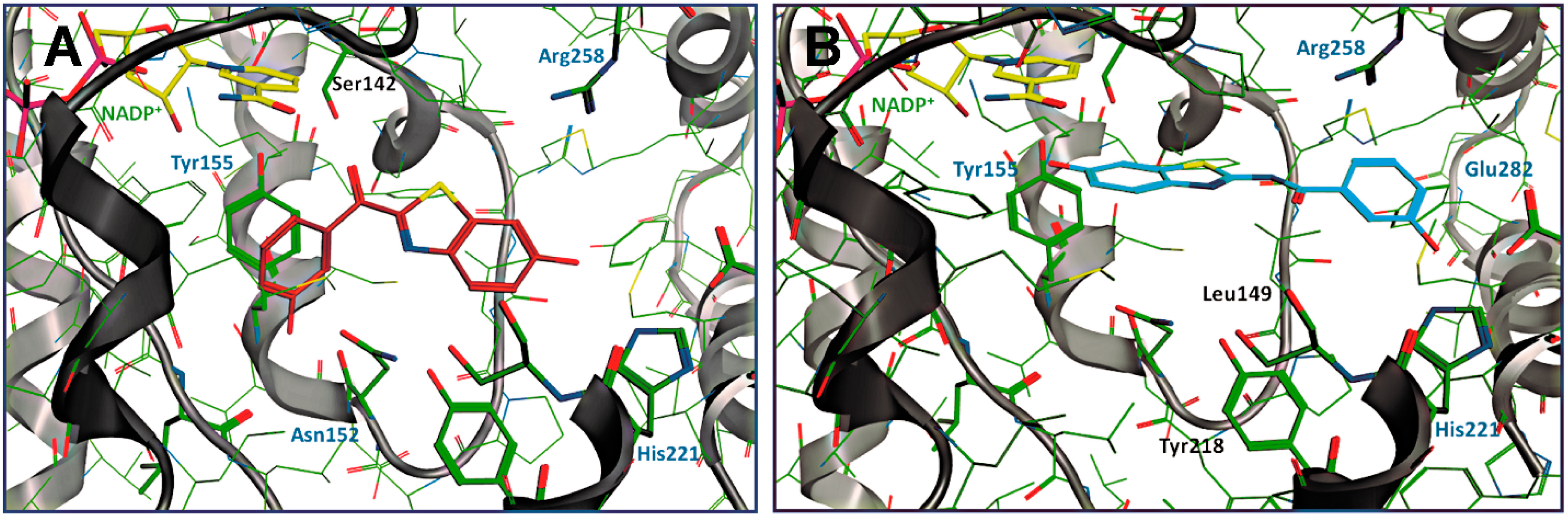 Yang et al. performed a study using different 11β-HSD1 crystal structures in order to identify synthetic 11β-HSD1 inhibitors [112]. They applied a combined approach of molecular docking and ligand-based pharmacophore modeling. For virtual docking calculations the crystal structure 1XU9 [113] and the program DOCK4.0 [114] were used to screen a commercial compound database. The 3000 compounds with the highest docking score were selected for a second docking run using Glide [115]. Additionally, a ligand-based pharmacophore model for selective 11β-HSD1 inhibitors was constructed using Catalyst 4.10 [116], which was used for screening the 3000 compounds with the Best Flexible Search mode. Compounds with high docking and good fit score were further evaluated by filtering for drug likeness and finally selected for biological testing on human and mouse 11β-HSD1. Importantly, other studies showed significant species-specific variability in the potency of various 11β-HSD1 inhibitors, indicating significant differences in the 3D organization of the hydrophobic substrate-binding pocket of human and mouse 11β-HSD1 [117,118]. Due to this issue, the tested compounds showed different inhibition profiles for the mouse and human enzyme. Eleven out of 121 tested compounds inhibited the human 11β-HSD1 with IC50 values of 0.26–14.6 μM, whereas six molecules inhibited the mouse 11β-HSD1 with IC50 values of 0.48–12.49 μM. Two substances displayed overlapping hits with IC50 for the human 11β-HSD1 of 0.69 μM and 3.57 μM and for the mouse isoenzyme of 0.48 μM and 2.09 μM, respectively. In order to test the selectivity over 11β-HSD2 for subsequent animal studies, only compounds inhibiting mouse 11β-HSD1 were tested for the inhibition of mouse 11β-HSD2. All compounds selectively inhibited 11β-HSD1. Nevertheless, selectivity assessment needs to include human 11β-HSD2 and, ideally, other SDRs. Cross-species activity would be the optimal situation for preclinical evaluation in the development of novel drug candidates.