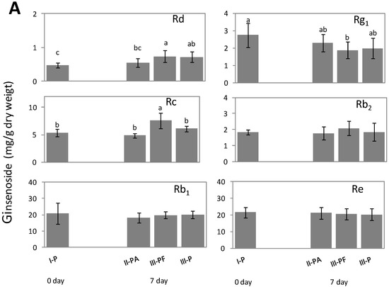 Contents of ginsenoside Rg1, Re, Rb1, Rc, Rb2, and Rd of American ginseng roots detected using HPLC in phloem tissues of the three parts (I, II, and III), including untreated (I-P), PDA-plugged (II-PA), Fusarium culture (III-PF) and untreated area adjacent to Fusarium culture (III-P). Samples were collected at 0 and 7 days after inoculation with (A) Fusarium solani; and (B) F. oxysporum. Mean values followed by the same letter or no letter were not significantly different (p < 0.05) in each ginsenoside (a panel in the figure), while followed by different letters were significantly different (p > 0.05), analyzed using Fisher’s least significant difference (LSD) test.