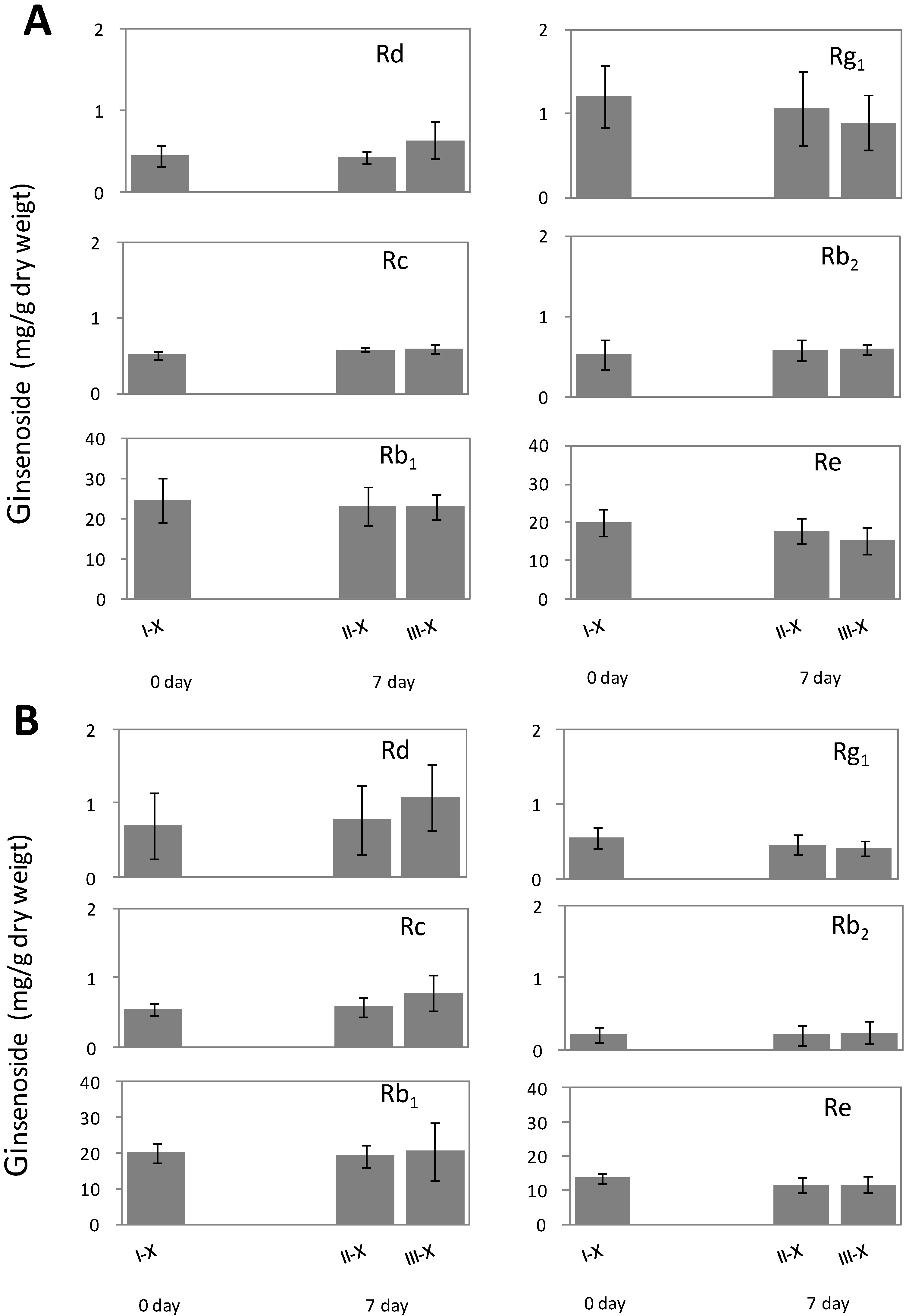 Measurement of ginsenoside (Rg1, Re, Rb1, Rc, Rb2, and Rd) contents (mg/g dry weight) in three root parts (I, II, and III) of healthy American ginseng in: (A) phloem and (B) xylem. Mean values of ginsenoside amongst the three root parts (I, II and III) are not significantly different at α = 0.05 (p > 0.05), analyzed using Fisher’s least significant difference (LSD) test.
