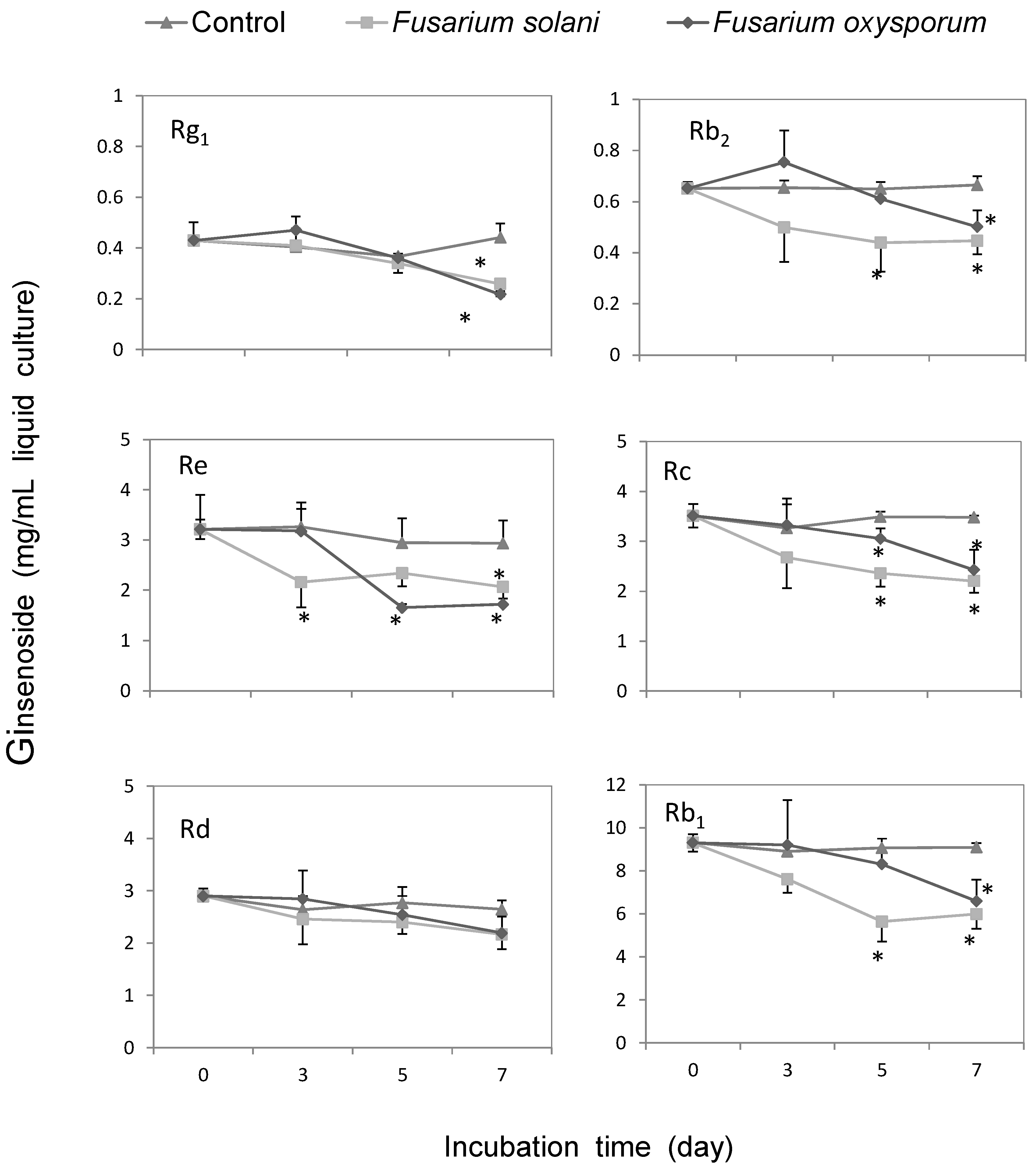 Metabolic effect of Fusarium solani and F. oxysporum on the concentrations of ginsenoside. Ginsenoside Rg1, Rb2, Re, Rc, Rd, and Rb1, were incubated with F. solani (square) or F. oxysporum (diamond) for 0 to 7 days. The values of ginsenoside content followed by an asterisk indicate a significant difference with control group (trilateral) at α = 0.05 (p < 0.05), as analyzed using Fisher’s least significant difference (LSD) test.