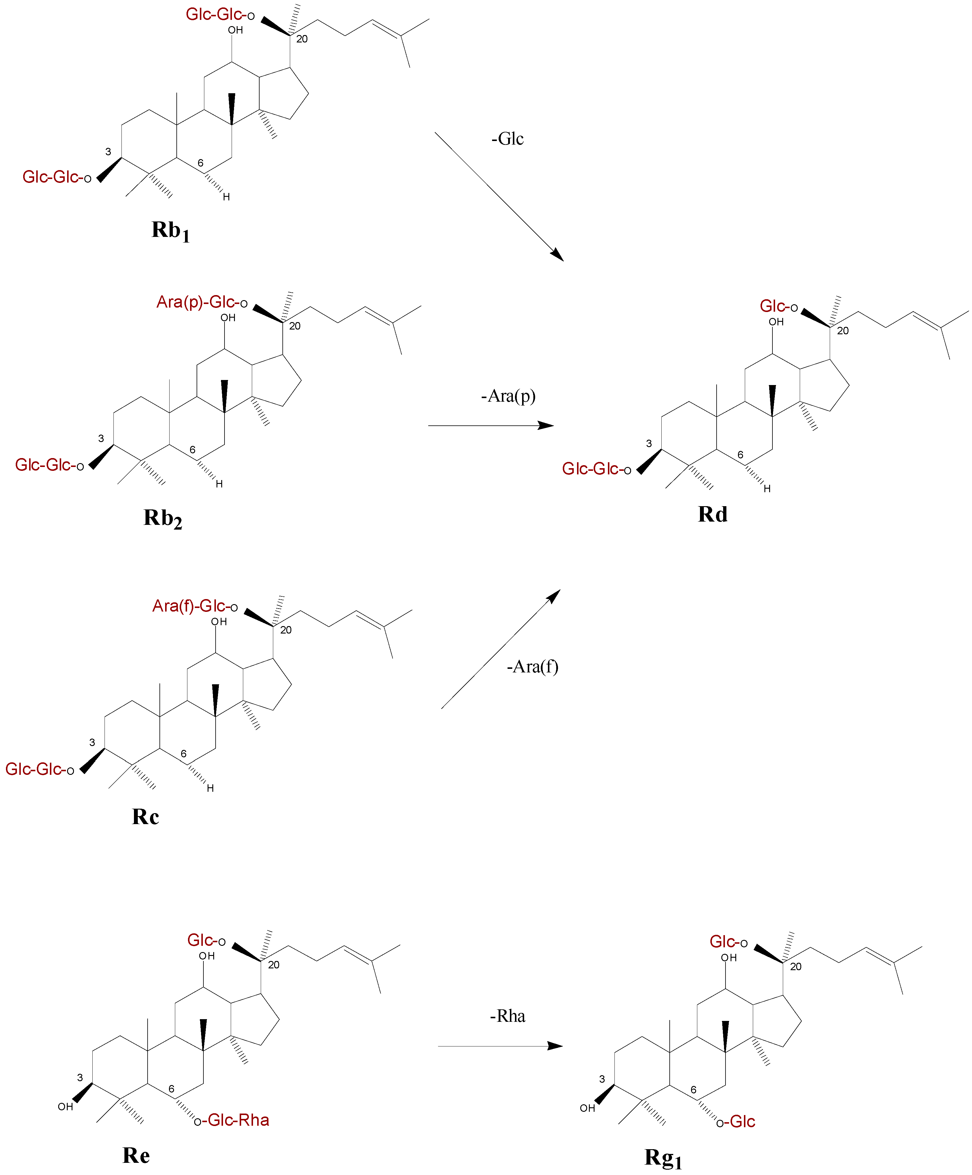 - Sample Availability: Samples of the compounds ginsenoside Rb1, Rb2, Rc, Rd, Re, and Rg1 are available from the authors.