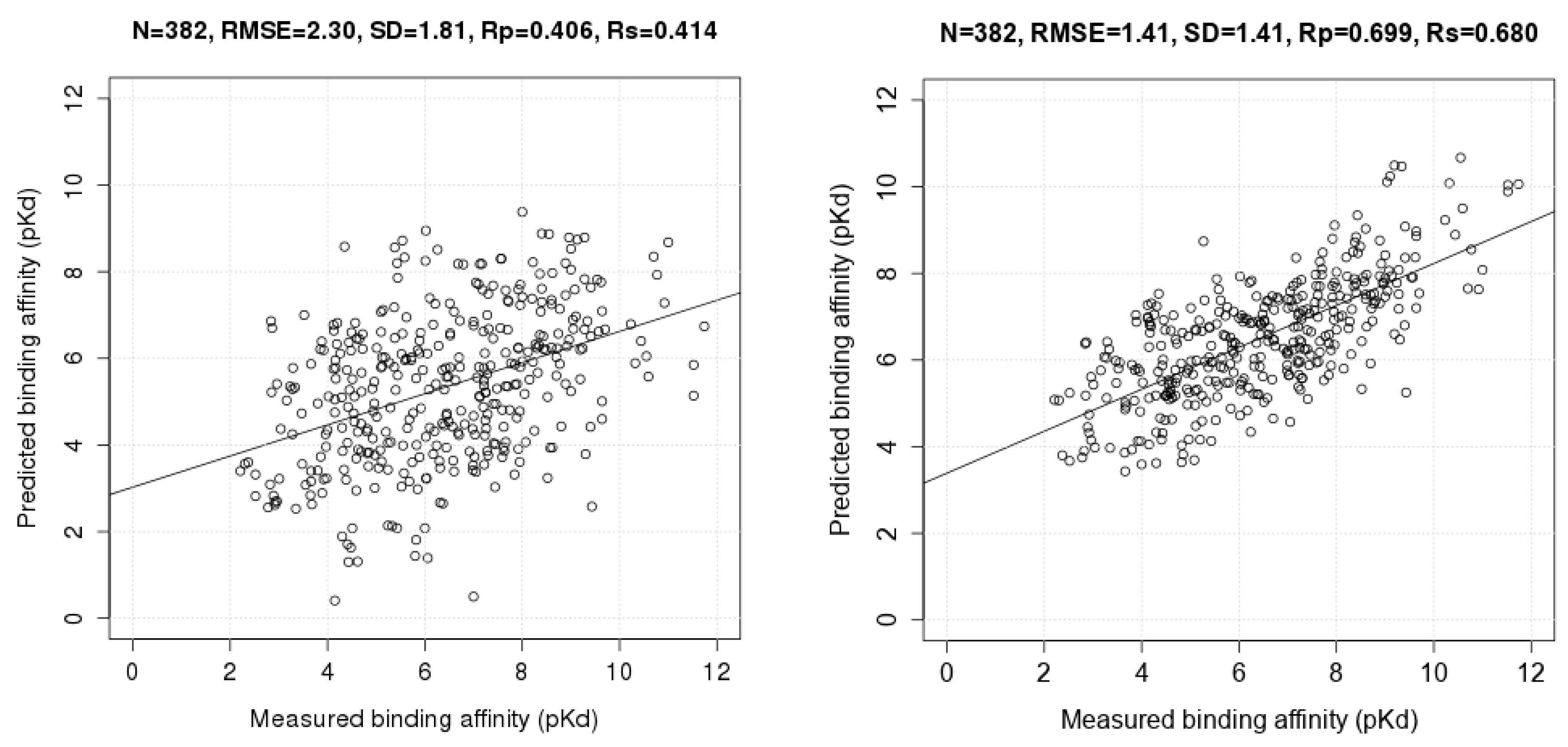Correlation plots of measured and predicted binding affinities by AutoDock Vina (model 1; (Left)) and RF::VinaElem (model 2; (Right)) trained on the largest dataset comprising new high-quality data (n = 3076) tested on PDBbind v2013 refined set minus v2012 refined set (n = 382).