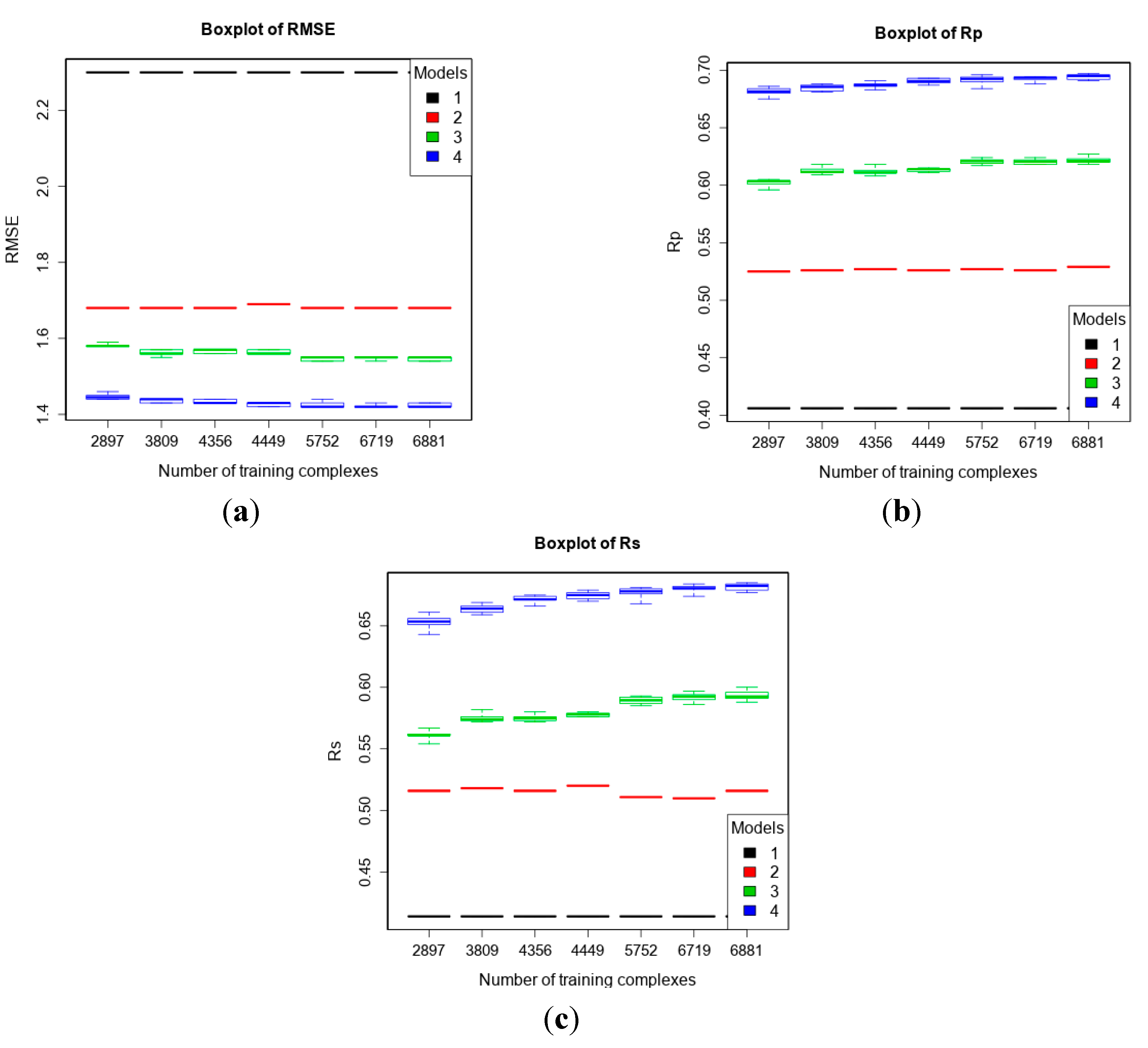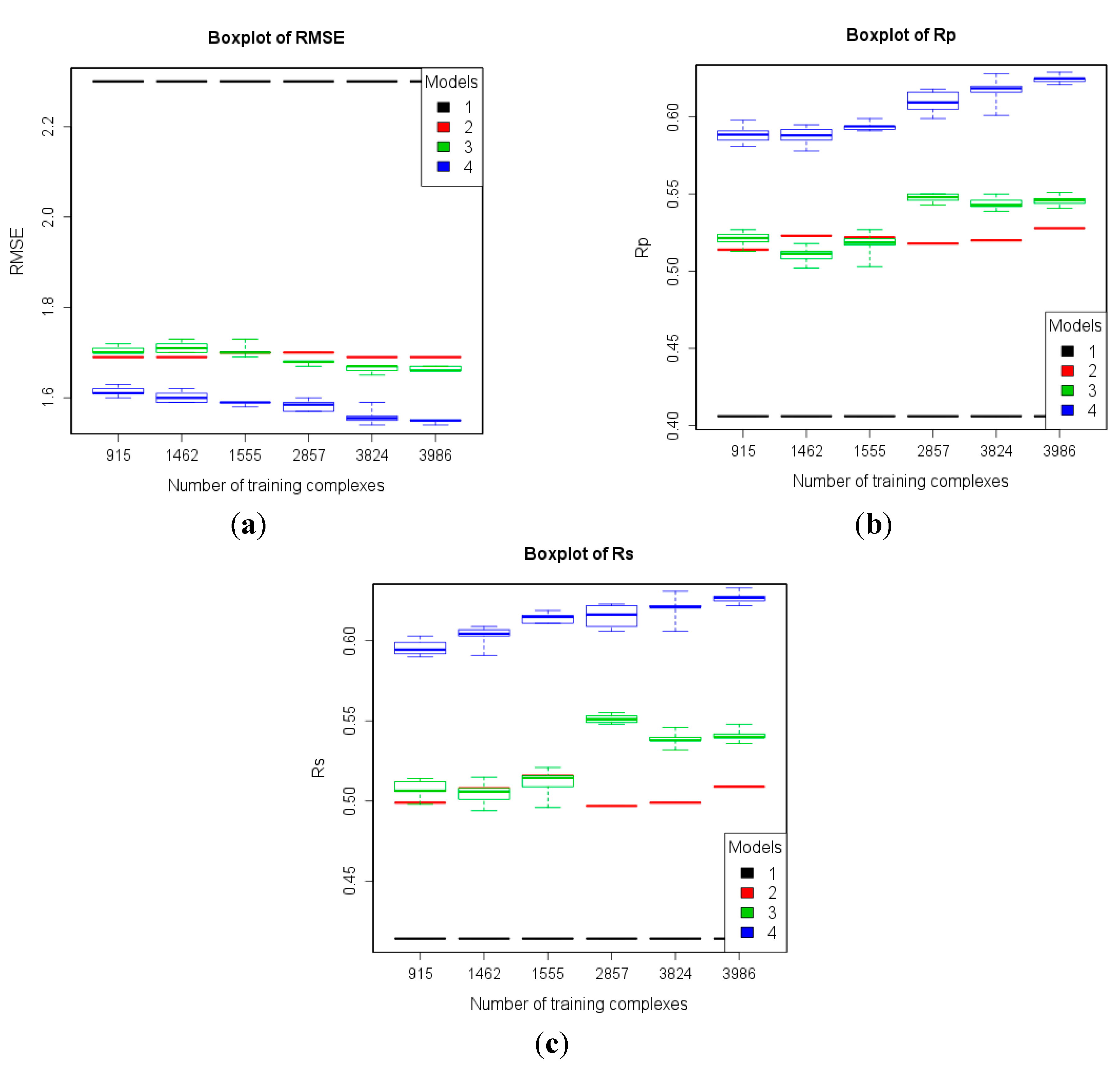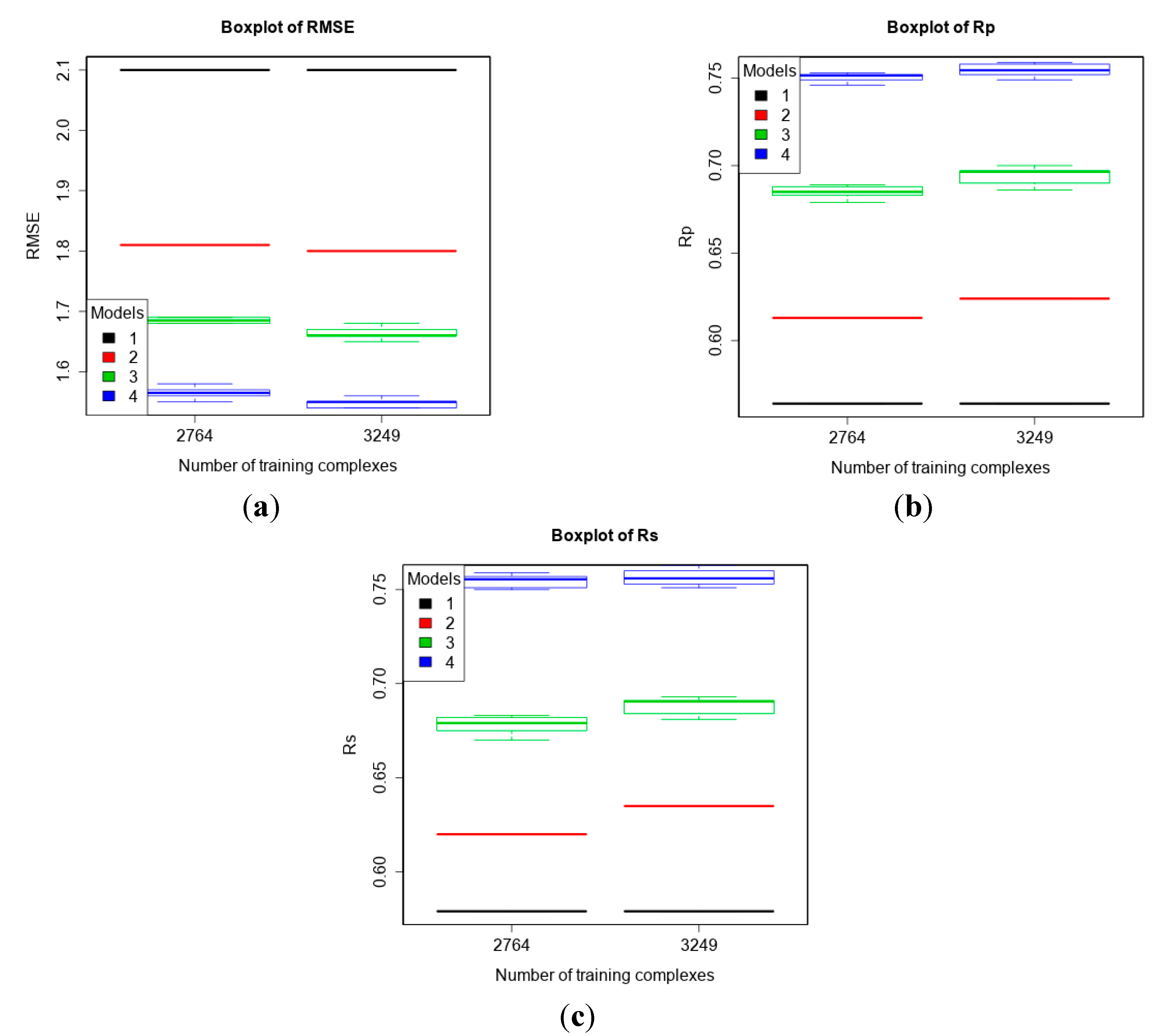 Models 3–4 are stochastic and thus their performance on a test set has a slight dependence on the random seed with which RF training is carried out. To investigate this variability, for each RF model and training set, 10 random seeds were employed to give rise to 10 slightly different trained RF models. For each seed, we built a RF model using the default number of trees (500) and values of the mtry control parameter from 1 to 6 for model 3, and from 1 to 42 for model 4. The selected model for a given seed will be that with the mtry value providing the lowest RMSE (root mean square error, see Section 2.3) on the subset of training data known as the Out-of-Bag (OOB) data [12]. Thus, each combination of RF model and training set gives rise to 10 instances of the trained model with their corresponding predictions, i.e., a boxplot of predictions. In this way, SFs can be compared by the median performance of their 10 RF model instances, which is a more accurate assessment than the usual procedure of basing the comparison on a single model instance from each SF.