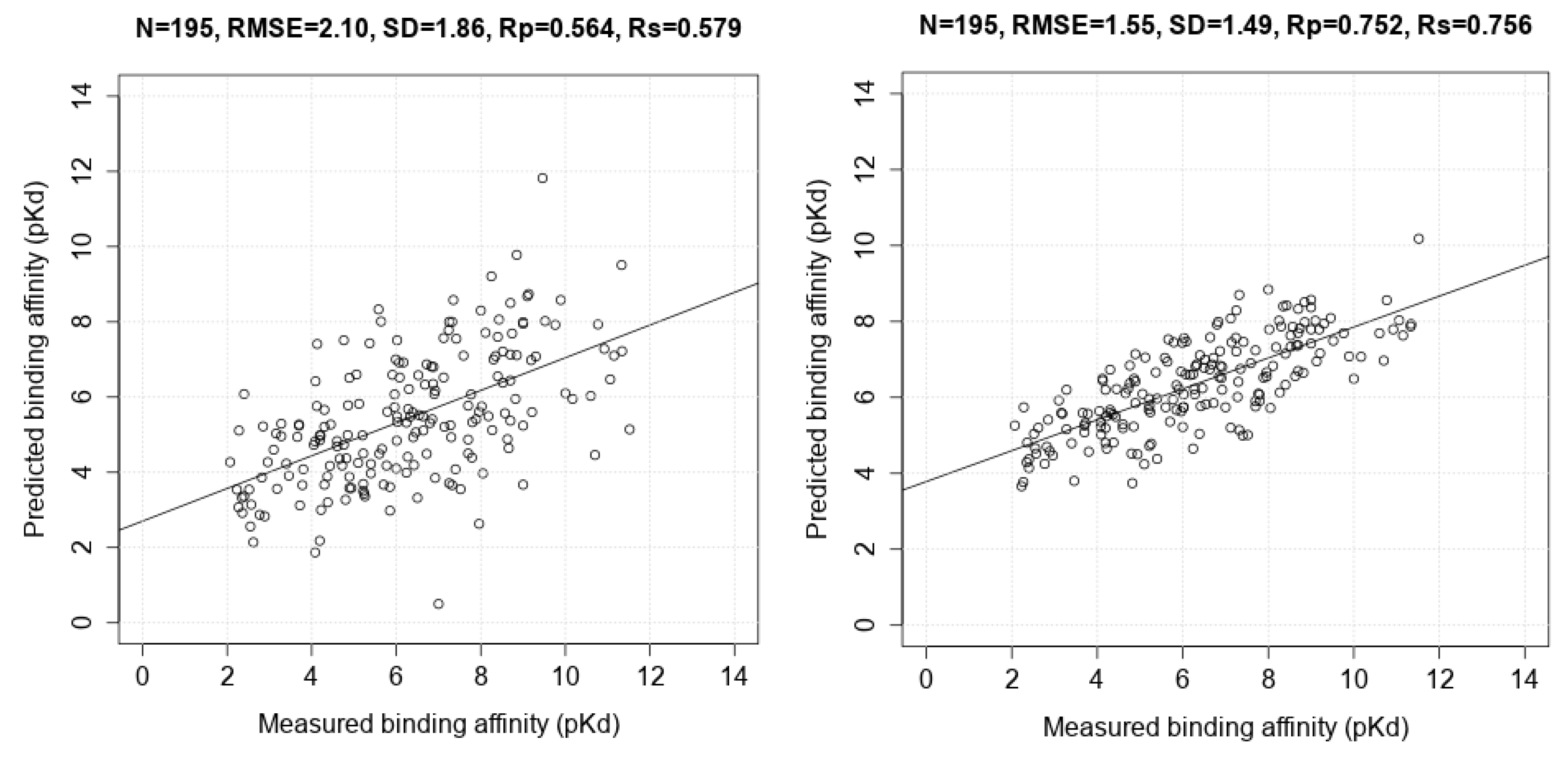 Figure 4 presents the two correlation plots comparing Vina and RF::VinaElem (model 4) trained with the 2764 complexes and tested on v2013 core set (n = 195).