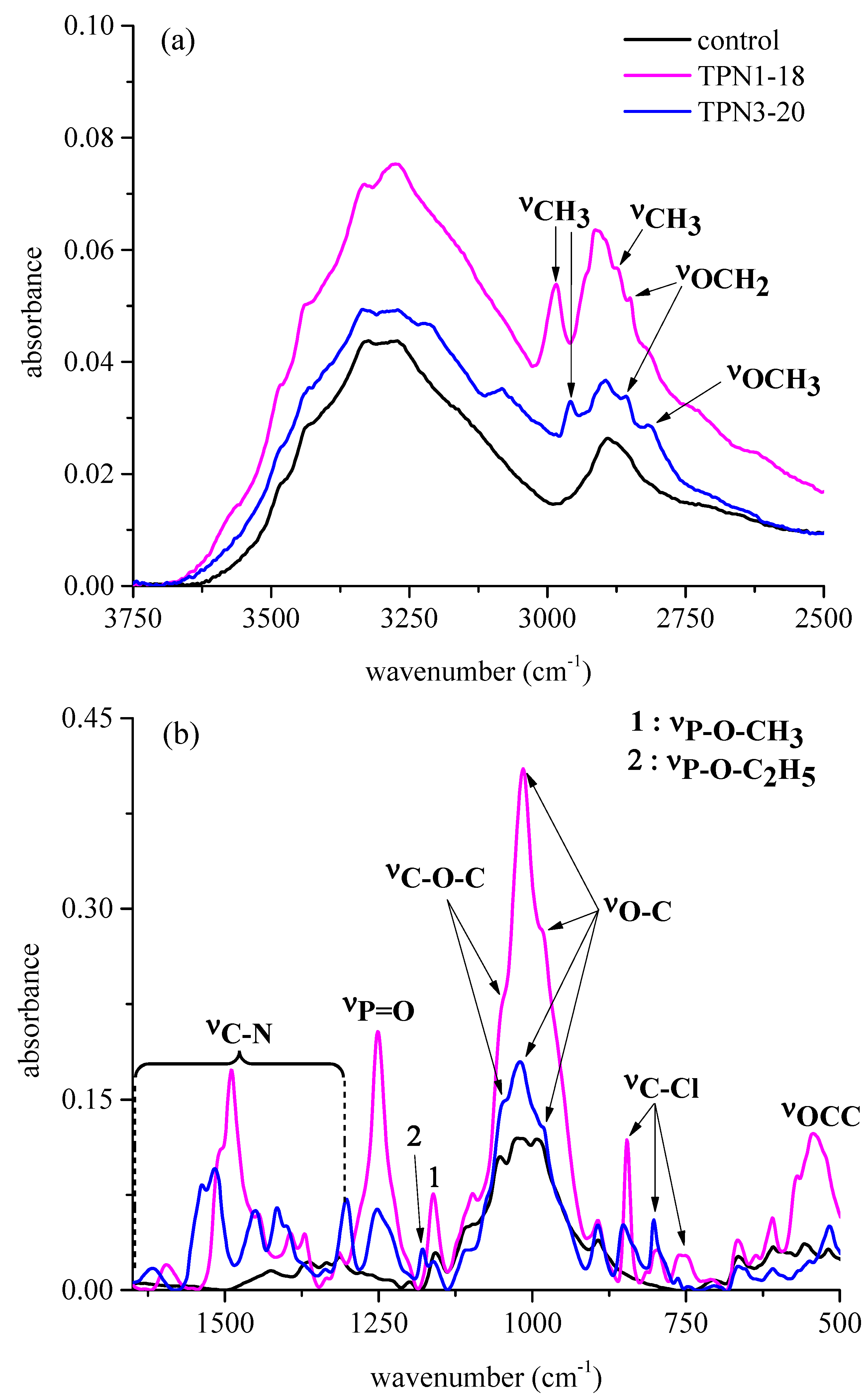 At 2984 and 2958 cm−1 (Figure 2a), the absorptions arise from CH3 stretching mode of TPN1 and TPN3 [28]. For TPN1, a weak absorption at 2882 cm−1 also corresponds to CH3 stretching mode. Furthermore, both treated fabrics contain absorptions at 2851 and 2858 cm−1. It is reported that the characteristic absorption for CH2 group appears at 2853 cm−1 and is ascribed to the out-of-phase vibration of hydrogen atom [28]. The mean values are constant in position, i.e., ±10 cm−1, for hydrocarbon substances including not only aliphatic compounds but also compounds such as diphenylmethane and benzyl alcohol [28]. Thus, these two absorptions belong to the CH2 that connects to the O (oxygen) in the two compounds. In the case of TPN3-20, a characteristic absorption arises at 2819 cm−1. This low value provides valuable group frequency for the identification of the OCH3 [28].