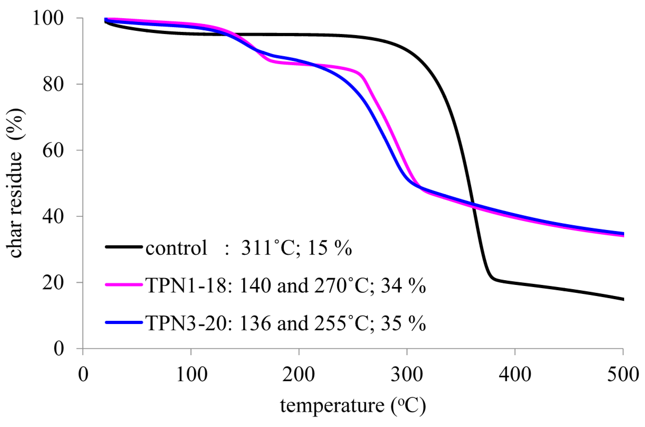 Thermal decomposition of the treated fabrics is compared to that of the control fabrics and the data are presented pictorially in Figure 3. The onset temperature and char residue of each fabric are also included. The study of degradation was performed at a temperature range of 25–500 °C for within this range the degradation activities of the FRs and cotton fabric can be easily observed. In general, the TPN1-18 and TPN3-20 display a lower onset of degradation in correlation to the control. Moreover, the treated fabrics exhibit a two-stage weight loss at 136 °C and 140 °C and 255 °C and 270 °C while the control shows a single-stage weight loss at 311 °C. In addition to exhibiting lower onset temperature, the treated fabrics also yield higher char at 500 °C when compared to the control. The TPN1-18 and TPN3-20 provide char at 34% and 35%, respectively, while the control produces char at 15%. In the two weight loss stages of the treated fabrics, the first stage loses less weight in comparison to the second stage. It is most likely that the first stage corresponds with the weight loss of the two FRs TPN1 and TPN3 and the second one characterizes the weight loss of the cotton fabrics. Details on both stages will be discussed below. Note that the degradation of TPN3-20 finishes earlier than TPN1-18 in both stages but the shape of its entire curve does not change much. This outcome is due to the insignificant weight loss in each stage of TPN3 chemical.