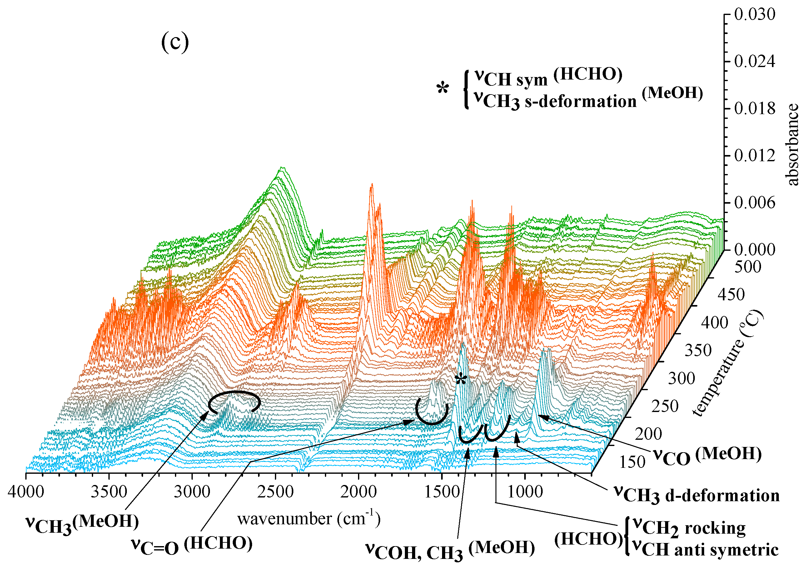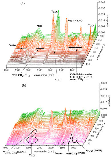 Previous investigations on the same cotton fabric and crystalline cellulose show that most gases are products of the degradation of cellulose units [34,35]. The degradation reactions include free radicals, oxidation, dehydration, decarboxylation, decarboxylation, and decomposition of cellulose to tarry pyrolyzate-containing levoglucosan, which vaporizes and then decomposes at a later time or at a higher temperature. These products contain mainly water vapor (~4000–3500 and 1800–1500 cm−1); hydrocarbon OH (~3650–3500 cm−1); hydrocarbon CH2, CH3 (~3018–2850 cm−1); CO2 (~2380–2310 and 632–710 cm−1); CO (~2200–2070 cm−1); C=O (~1850–1600 cm−1) and C-O-H deformation, C-O-C, C-H, C-C and C=C (~1500–900 cm−1).