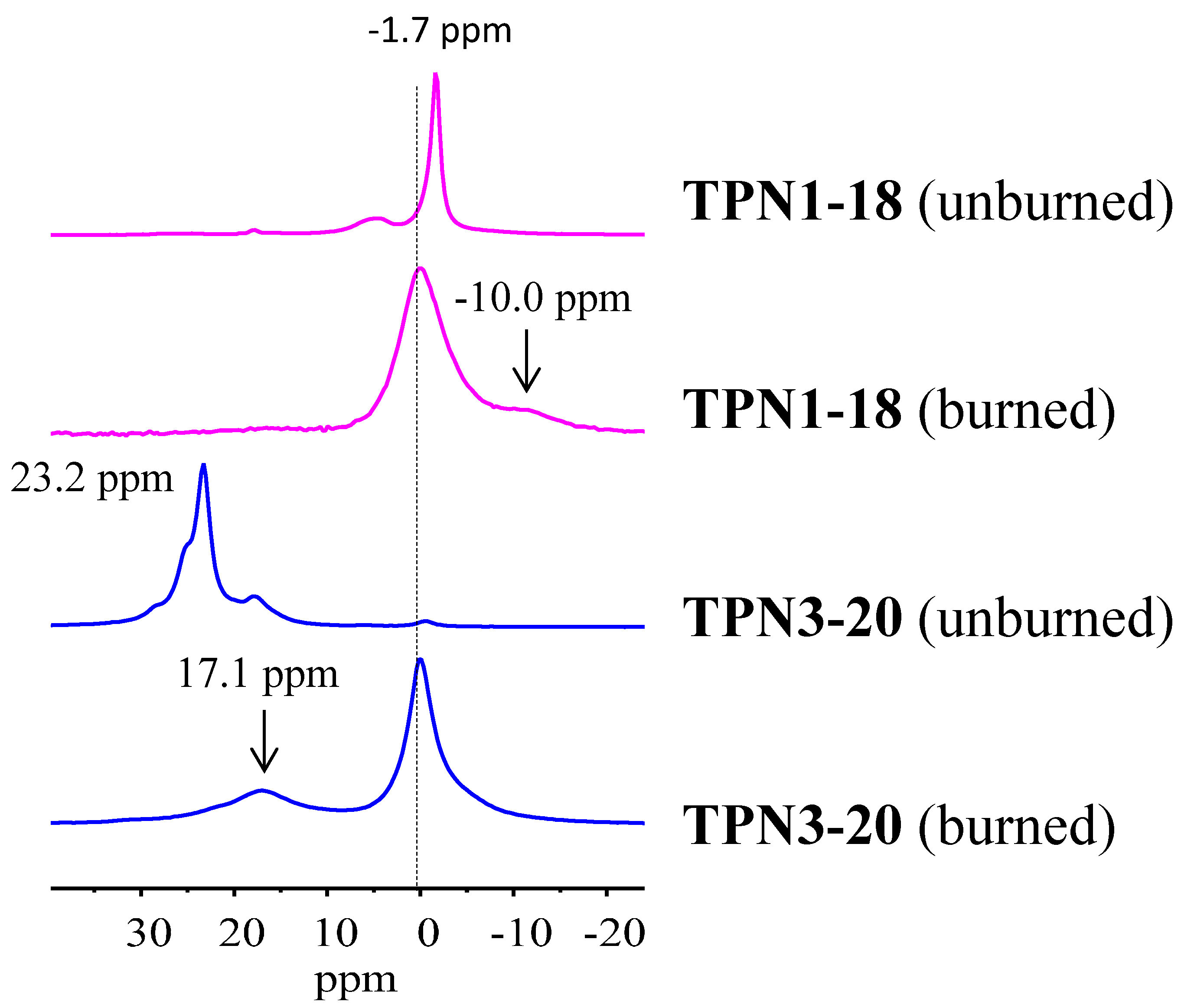 This experiment was carried out on unburned and burned samples of treated fabrics TPN1-18 and TPN3-20. Initially, all fabrics were ground by a Thosmas Wiley mill to produce 40-mesh samples. This study utilized a Bruker Avance 500 MHz (11.7 T) wide-bore spectrometer (Bruker, Billerica, MA, USA) equipped with a doubly-tuned magic angle spinning (MAS) probe. Each sample in this experiment was packed into a 4 mm zirconia rotor and spun at an MAS speed of 12 kHz. The NMR spectra were collected using high power proton decoupling during the acquisition period and signal averaged for either 1024 or 4096 transients. Spectra were externally referenced to a sample of 85% H3PO4 at 0.0 ppm.
