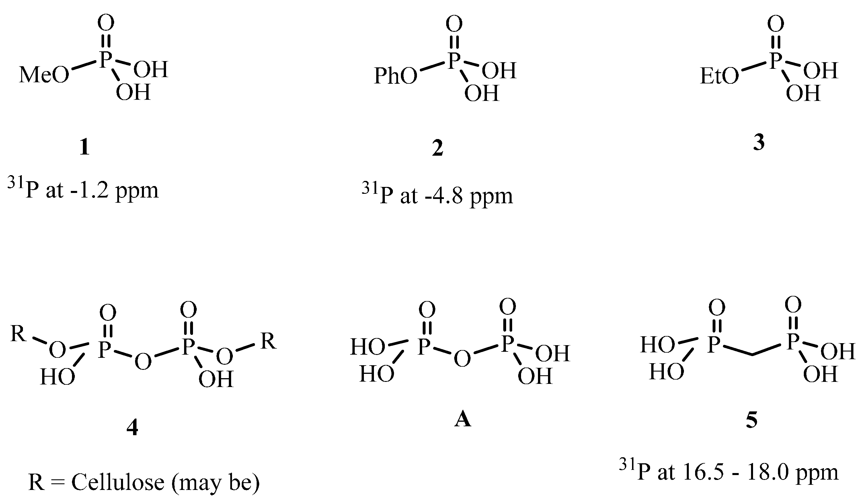 In addition to the H3PO4 peak, the burned spectra contain small peaks that appear at −10.0 ppm for TPN1-18 and 17.1 ppm for TPN3-20. They are likely the side products from the decomposition of TPN1 and TPN3 with possible structures of 4 [59,60,61] and 5 [62,63,64] (Figure 7), respectively. Furthermore, the side product in TPN1 cannot be the pyrophosphoric acid A (Figure 7) as this has a 31P chemical shift at −14 ppm [65]. It is also indicated that an acid like A has a phosphorus signal at −10.0 ppm when 5′-O-Nucleoside or 3′-O-Nucleoside replaces one OH on each side [59]. Thus, in this process it is speculated that the cellulose plays the same role as the two nucleosides. Interestingly, the partly burned sample of the compound that contains the P(O)(OC2H5)2 group mentioned above [56] also gives a peak at around 17–18 ppm in 31P-NMR spectrum. More importantly, this compound also contains -CH2-O- next to the phosphorus as in TPN3. The only difference is that the phosphorus in TPN3 connects to OCH3 where as the phosphorus in that compound attaches to OC2H5. Unfortunately, no identification of the peak at 17–18 ppm is provided in the paper [56].
