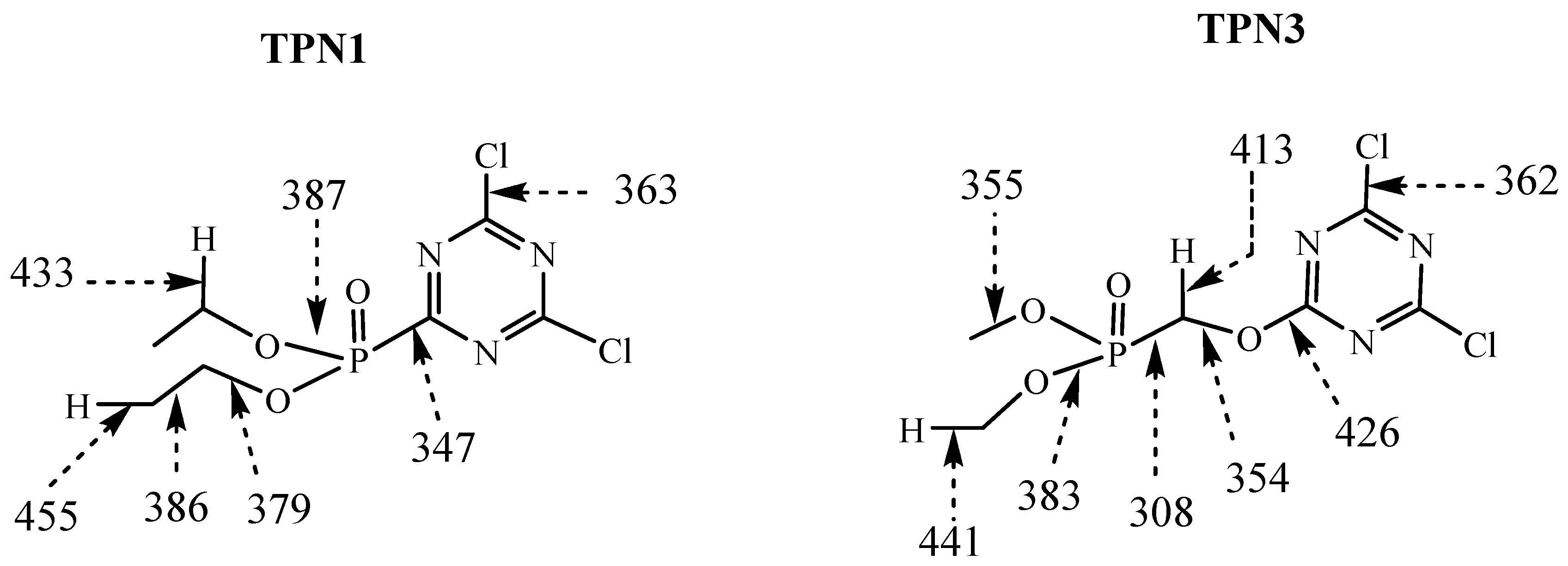 As seen in Figure 8, the calculations show that the C-P bond is the weakest bond in comparison to the rest of the bonds in each system and the energy value is smaller in TPN3 than it is in TPN1. This may be due to the connection of the C with other group; this means that C belongs to aromatic ring in TPN1 but it is part of methylene group in TPN3. An investigation of BDE of organophosphorus compounds using high-level ab initio methods in different procedures BMK, M05-2X and SCS-ROMP2 also reveal that P-CH3 bond has lower BDE as compared to P-Ph bond [69]. In both structures the average bond is the C-Cl bond and the energy value for their bond dissociation is almost the same. Previous studies on BDE for this type of bond (i.e., N=C(Cl)-C or N=C(Cl)-N on mono- or di-substituted chloro-triazine, -pyrimidine, -pyrazine, and -pyridazine systems) show similar results [70].