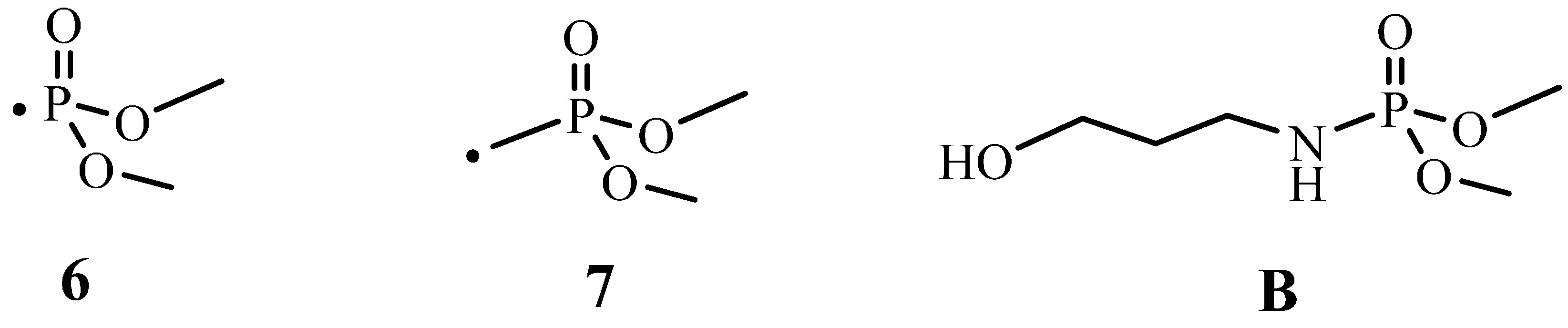 On the other hand, the degradation of TPN3-20 is more perplexing due to some side reactions. After the initial cleavage of the phosphonate group at the C-P bond, the CH2-O bond might be broken to generate a methylene species that might be reactive. This species then reacts with some phosphonate 6 (Figure 9), which comes from the initial breaking to form 7. Later, 6 and 7 combine to give the methylene diphosphonic acid, a minor char. The computational studies also support the cleavage of the CH2-O bond as the next step. Moreover, the formation of some methylene species in the presence of water might produce the HCHO. This may account for the late appearance and small intensity in the C=O absorption of HCHO (Figure 4b). It is unlikely that the C-Cl bond not the CH2-O bond breaks after the breaking of C-P bond to give the HCHO since this step does not support the formation of methylene diphosphonic acid. One might reason that the MeOH released from the decomposition of TPN3 can form the HCHO. Previous studies done by the same authors show that a phosphoramidate flame retardant B (Figure 9) containing the same phosphonate moiety does not produce HCHO when it decomposes [44]. It is unlikely, therefore, that the formation of HCHO in this experiment comes from the phosphonate moiety. Furthermore, the reaction requires much higher temperature for the MeOH to convert to the HCHO. As reasoned above, the dissociation of the phosphonate moieties results in the formation of two types of char in which the major char develops first. The formation of the major char causes a release of reasonable amount of MeOH and EtOH. In Figure 4a,b, the observable absorptions for the CH2 and CH3 at around 3000 cm−1 in MeOH and EtOH are only seen at a later time. It is likely that in their earlier stage these absorptions are masked by the release of the HCl. After the decomposition of the phosphonates in TPN1 and TPN3, the cellulose starts to decompose. Since the H3PO4 layer acts as a thermal coating, it prevents the degradation of cellulose during this process.