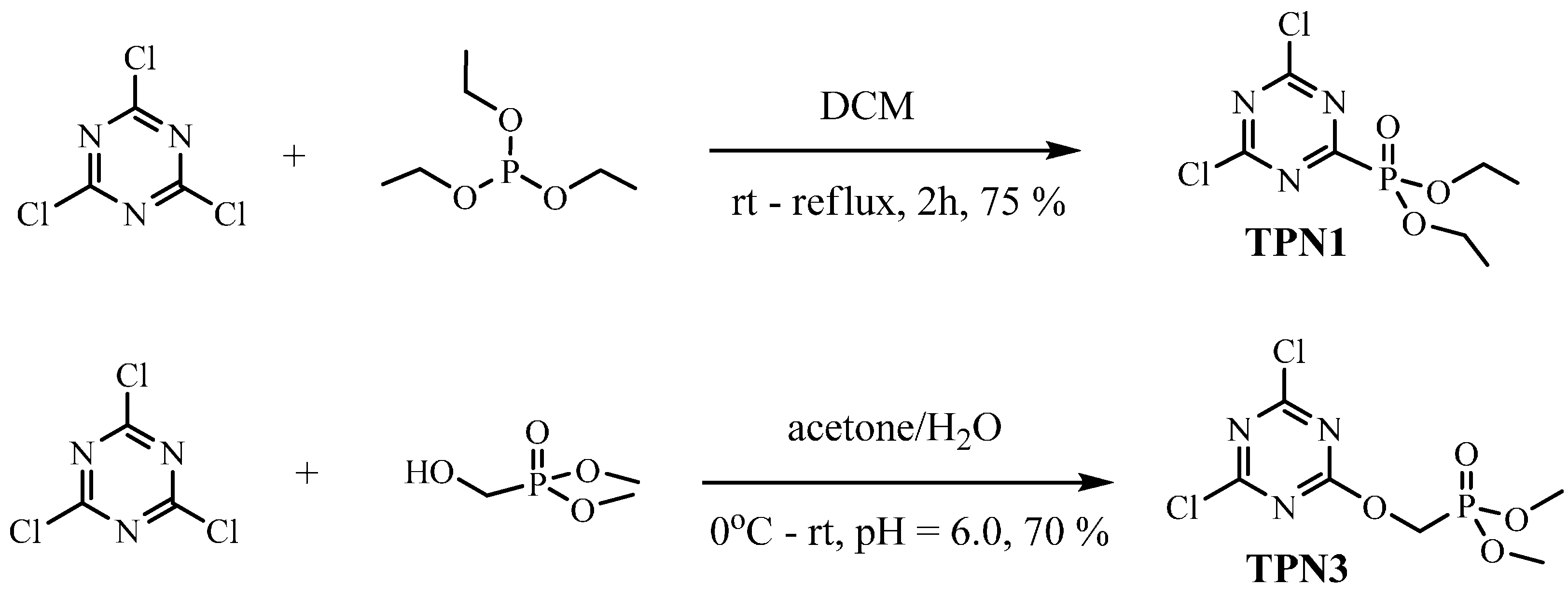 The preparation of TPN1 was achieved following the published literature of Mikroyannidis [31]. A mixture of cyanuric chloride (5.0 g, 27.1 mmol) and dichloromethane (DCM) (50 mL) was stirred at room temperature until completely dissolved. Triethylphosphite (5.04 g, 27.7 mmol) in dry DCM (50 mL) was added dropwise to this solution. When the addition was complete, the reaction mixture was refluxed under nitrogen for 2 h and then monitored by thin layer chromatography (TLC) using 5% MeOH/DCM as an eluent. When the reaction was complete, the organic layer was separated, dried in vacuo and the residue was purified by column chromatography (c/c) (silica gel, 5% MeOH/DCM) to furnish TPN1 as a yellowish oil in 75% yield. 1H-NMR (400-MHz, CDCl3) δ-ppm: 1.44–1.48 (m, 6H), 4.42 (t, 4H). 13C-NMR (100-MHz, CDCl3) δ-ppm: 16.4 (d, J = 6 Hz), 65.5 (d, J = 6 Hz), 172.4 (d, J = 20 Hz), 174.1–176.7 (d, J = 260 Hz). 31P-NMR (162-MHz, CDCl3) δ-ppm: 0.68. m/z observed 286.0 (calcd. 286.05).